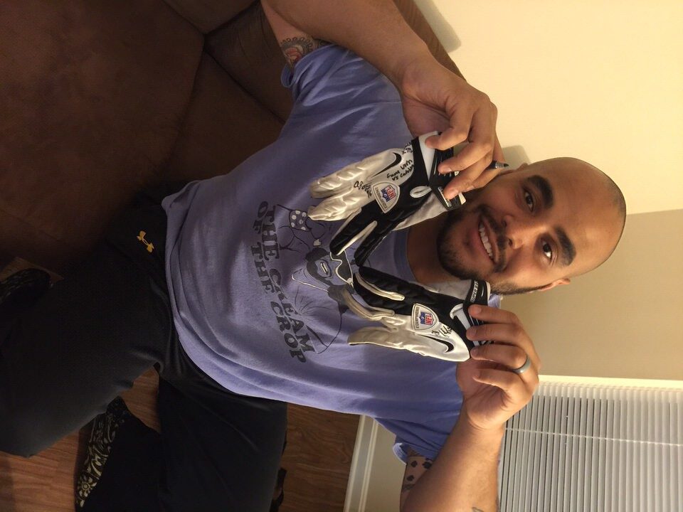 The featured white, gray and black nike gloves were game worn by AJ Francis when the Miami Dolphins faced the Carolina Panthers on August 22nd, 2015. Miami Dolphins quarterback Ryan Tannehill completed 12 of 15 passes for 102 yards and a touchdown, Damien Williams scored twice but the Dolphins fell short 31-30 to the Carolina Panthers. The talented defensive lineman added 2 Tackles for a Loss (TFL) and a Sack. Francis has signed the gloves and added “Game Worn Vs Carolina, 1 Sack 2 TFL” to the left one in black. The gloves show good use!!