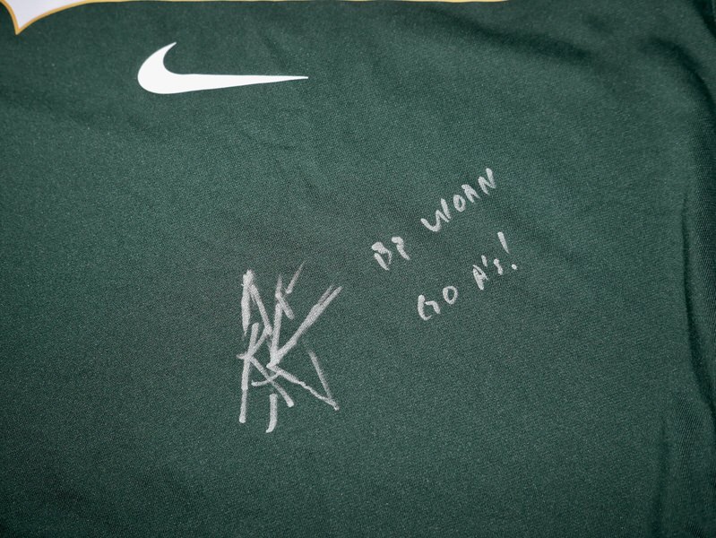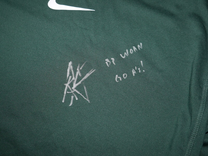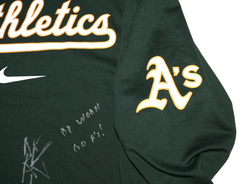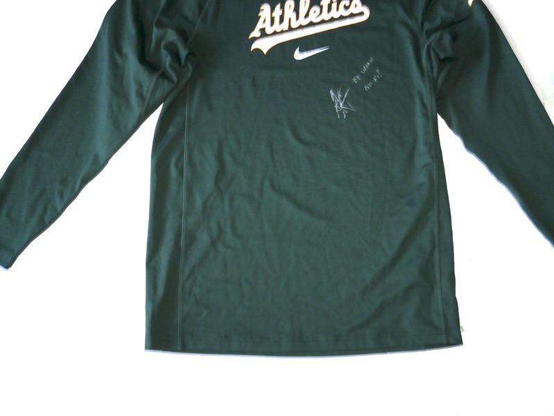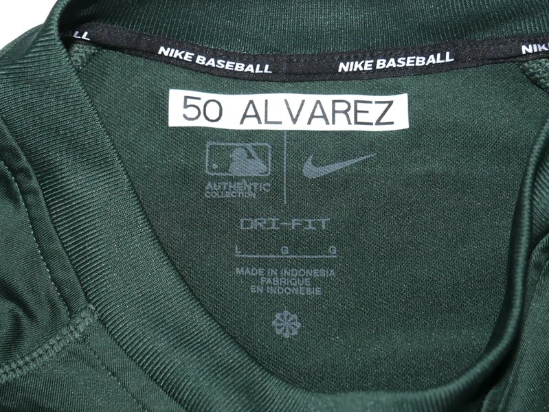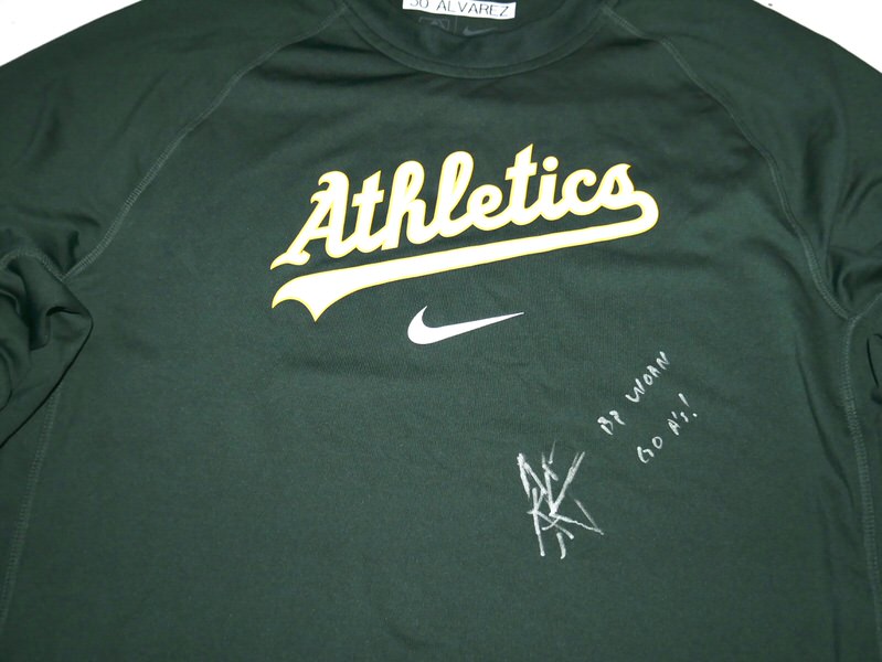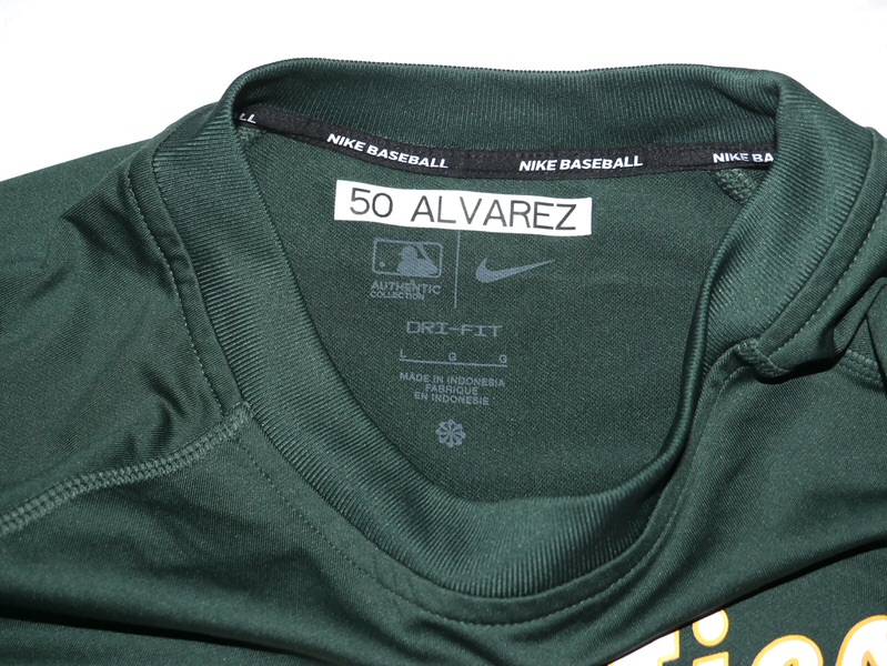 The featured official green Oakland Athletics Long Sleeve Nike Shirt was issued to and worn in Batting Practice by Armando Alvarez in 2024 as a member of the Oakland Athletics. The Shirt is heavy, feels like a light sweatshirt. Alvarez played in 16 games with the A’s and notched 9 Hits in 37 At-bats for a .243 clip. Alvarez signed the Shirt and added “BP Worn” and “Go A’s!” in silver. The collar area of the Shirt features an Oakland Athletics player issued “50 ALVAREZ” label. The Shirt was obtained directly from Armando Alvarez!!! Awesome Shirt for an A’s Fan!!!