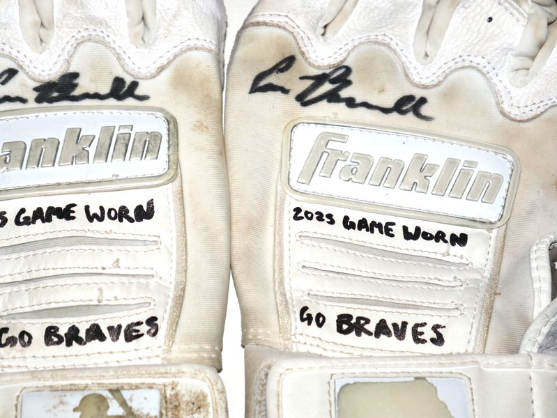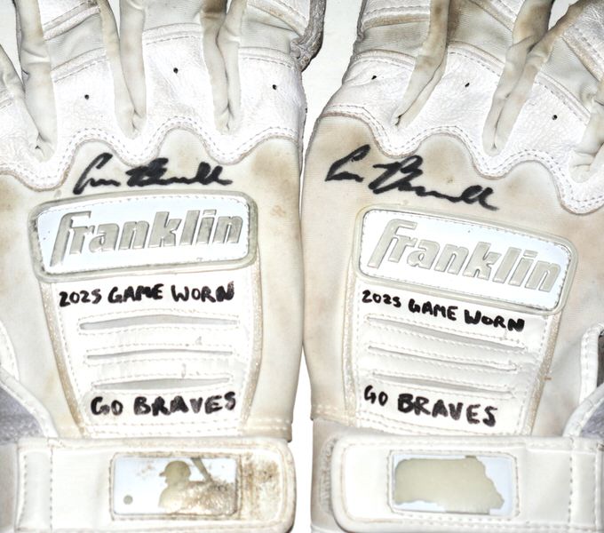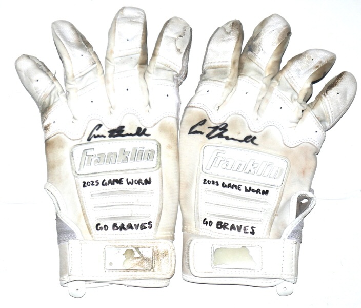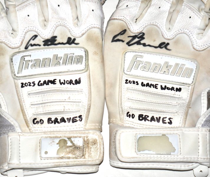 The featured white and grey Franklin Batting Gloves were game worn by Cade Bunnell in 2025 as a member of the Columbus Clingstones. The Columbus Clingstones are a Minor League Baseball team of the Southern League and the Double-A affiliate of the Atlanta Braves. They are located in Columbus, Georgia, and play their home games at Synovus Park. Bunnell signed the Gloves and added “2025 Game Worn” and “GO BRAVES” in black. The Gloves show good use with a tear in the palm of the right glove. The Gloves were obtained directly from Cade Bunnell!!!