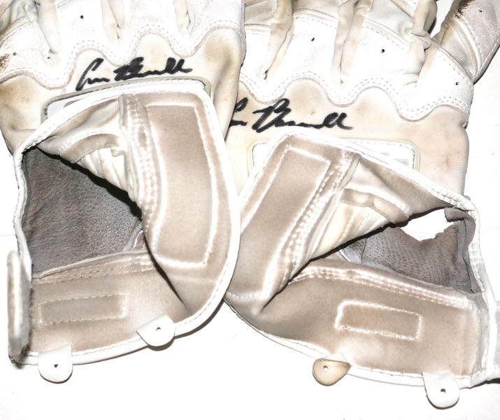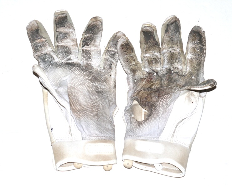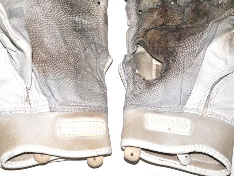 Cade Bunnell 2025 Columbus Clingstones Game Worn & Signed White & Grey Franklin Batting Gloves – Good Use with a tear in the palm of the right glove!