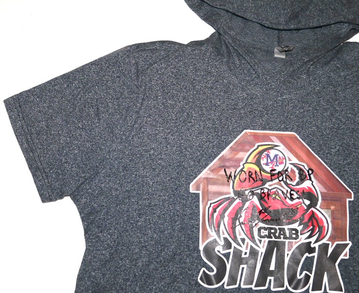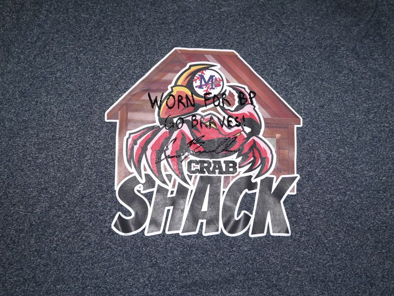 The featured lightweight Mississippi Braves Crab Shack Short Sleeve Hooded Sweatshirt was issued to and worn by Cade Bunnell in batting practice as a member of the Mississippi Braves. The Mississippi Braves, or M-Braves as they were referred to locally, were a Minor League Baseball team based in Pearl, Mississippi, a suburb of Jackson. The team was the Double-A affiliate of the Atlanta Braves and played in the Southern League. They have since become the Columbus Clingstones. Bunnell signed the Pullover and added “WORN FOR BP GO BRAVES!” in black. The pullover was obtained directly from Cade Bunnell!