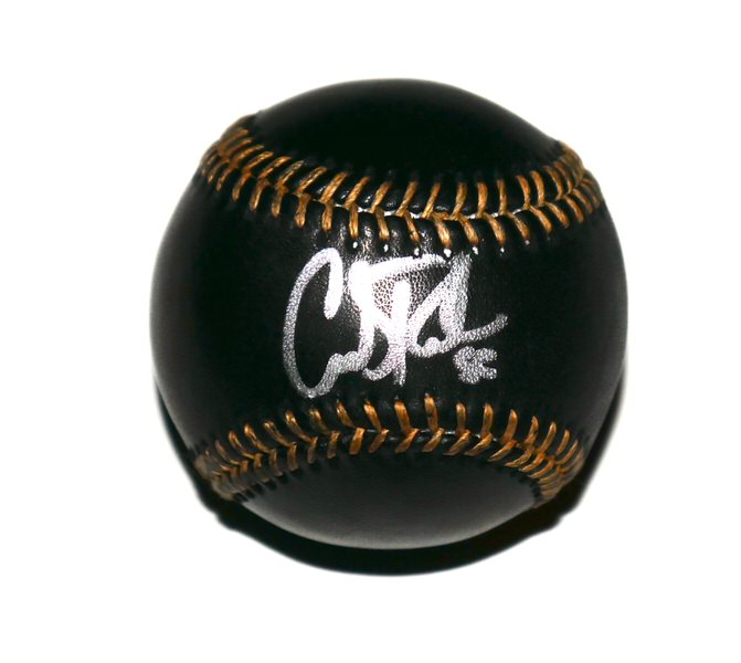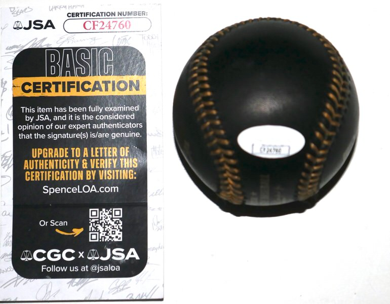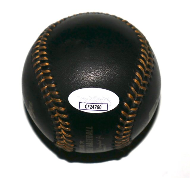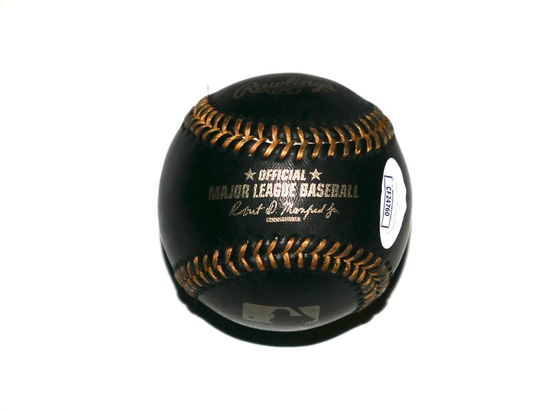 This Rawlings Official Major League Black Leather Baseball is an authentic piece of sports memorabilia signed by New York Yankees pitcher Carlos Rodón. The signature is rendered in silver ink, which is standard for black leather “Black Gold” or “Signature Series” baseballs to ensure high visibility against the dark surface. A tamper-evident, numbered sticker from James Spence Authentication (JSA) is affixed directly to the baseball. A Certificate of Authenticity (COA) with a serial number matching the hologram is provided, allowing you to verify the signing details on the JSA official database.