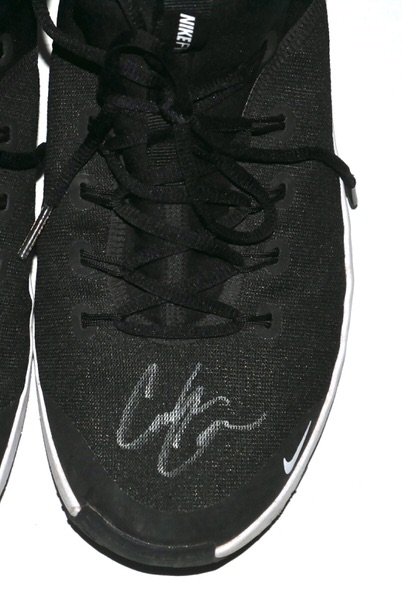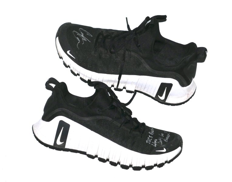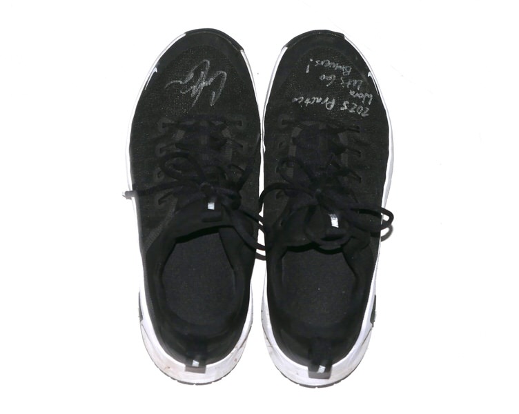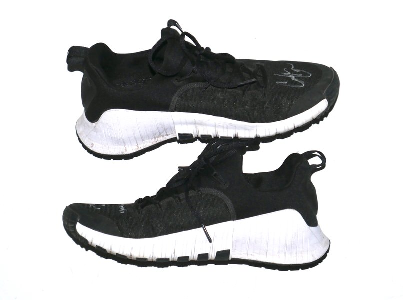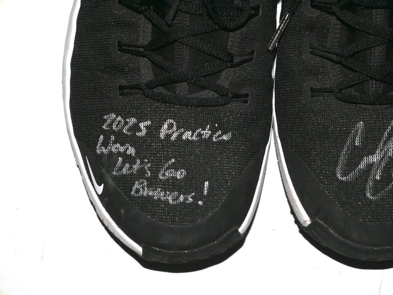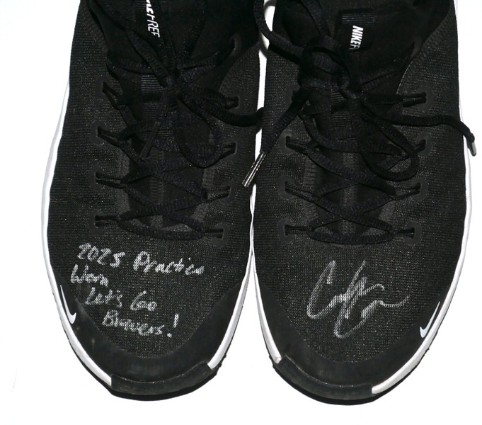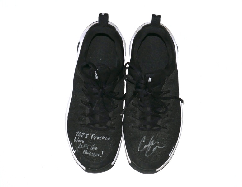 The featured black and white Nike Metcon Shoes were worn in practice by Coleman Crow in 2025 as a member of the Biloxi Shuckers. The Biloxi Shuckers are a Minor League Baseball team of the Southern League and the Double-A affiliate of the Milwaukee Brewers. They are located in Biloxi, Mississippi, and are named in reference to the city’s oyster industry and seafood heritage. Crow appeared in 10 games for Biloxi and went 4-0 with a 2.51 ERA before being promoted to the Triple-A Nashville club. Crow signed the left shoe and added “2025 Practice Worn Let’s Go Brewers!” to the right one in silver. The Shoes show light wear and were obtained directly from Coleman Crow!!!