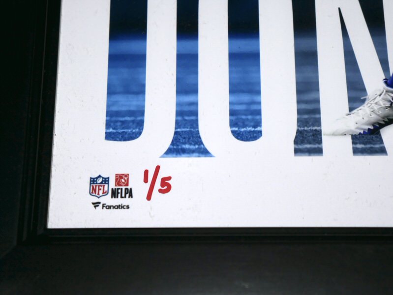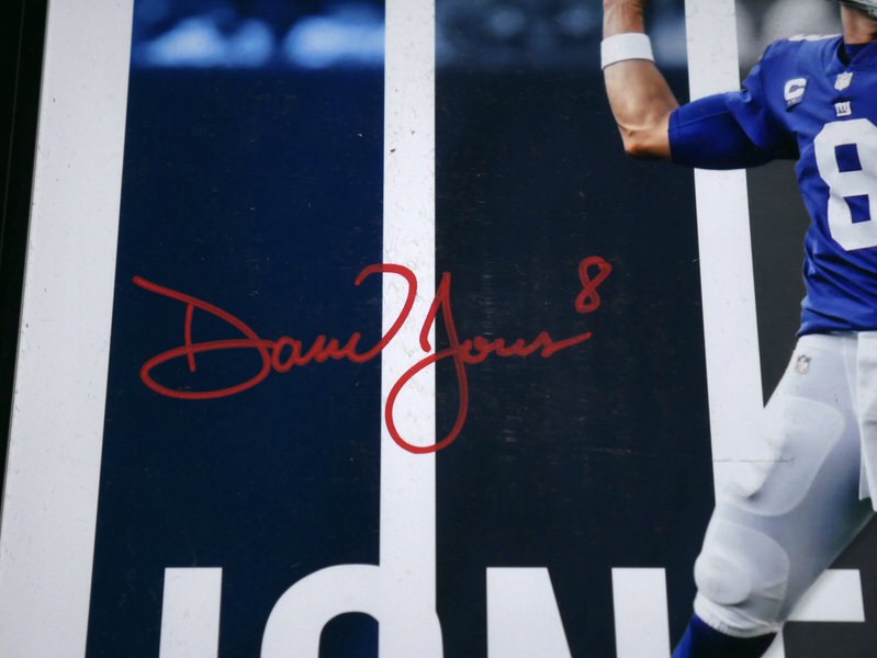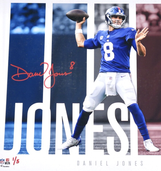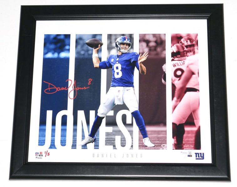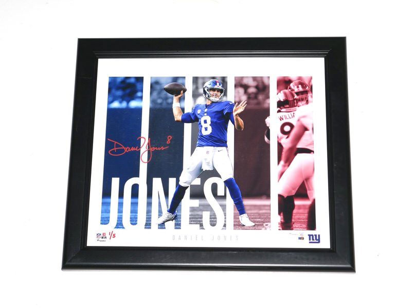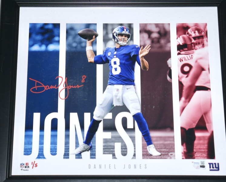 The featured New York Giants Photo has been flawlessly signed by Daniel Jones in red. This dynamite Photo is custom framed and measures 17 x 15. The Photo is #1 of a limited edition of 5 done by Fanatics. The Photo includes a Fanatics hologram for authenticity purposes. Awesome and Unique Piece for an NFL Fan!