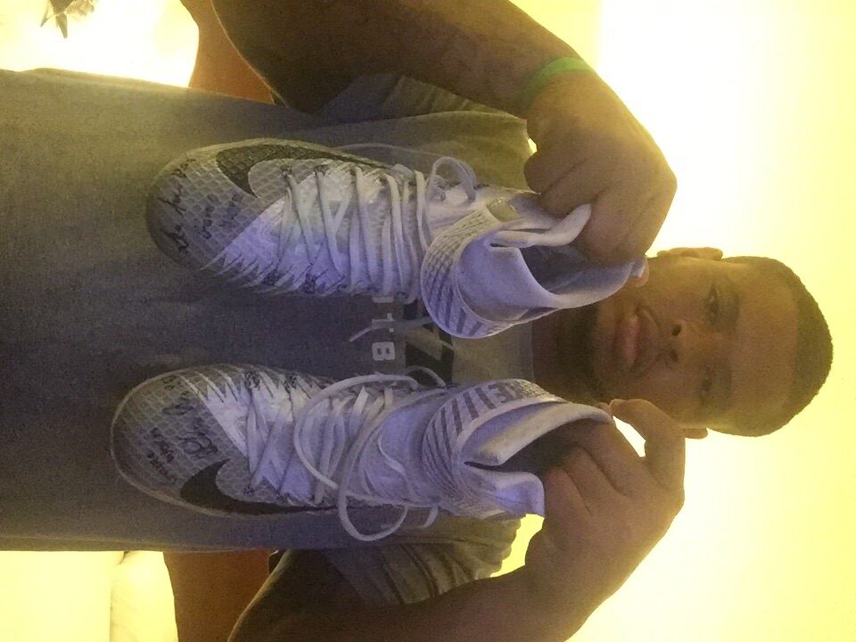 The featured white, silver and black size 14 nike lunarbeast elite td cleats were game worn by Deon Simon as a member of the New York Jets. These dynamite cleats are made with stabilizing Flywire cables for a locked-down feel. A full-length Lunarlon midsole cushions your foot from heel to toe. Simon has signed the cleats and added “Game Worn” in black. There is a New York Jets issued “93 SIMON” label on the bottom of each cleat and they show good use!!!