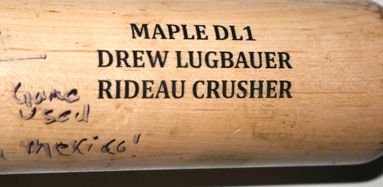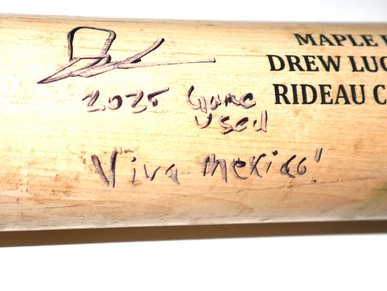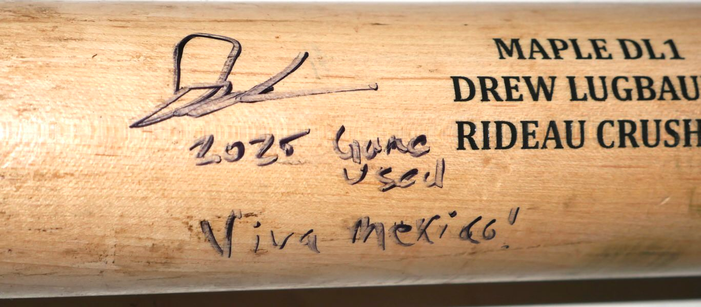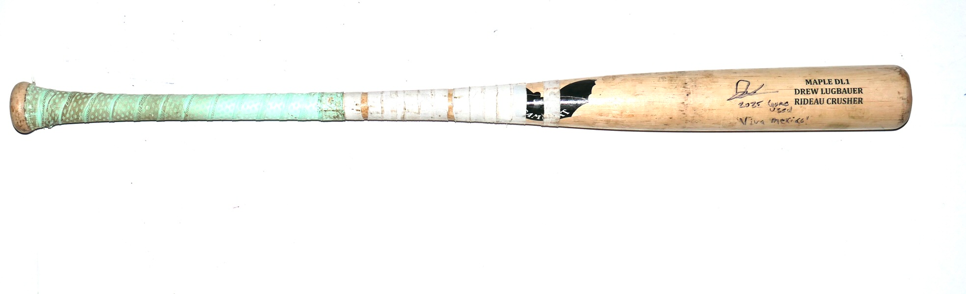 The featured SAM Rideau Crusher Maple Baseball Bat was game used by Drew Lugbauer as a member of the Algodoneros Union Laguna. The Union Laguna faced the Toros de Tijuana in the 2025 Postseason and were eliminated in the first round, with the Toros winning the series. The Algodoneros de Unión Laguna are a professional baseball team in the Mexican League (LMB). Based in Torreón, Coahuila, they play in the North Division of LMB. Lugbauer signed the Bat and added “2025 Game Used Viva Mexico!” in black. The Bat is CRACKED. Awesome and unique Game Used Bat obtained directly from Drew Lugbauer!!!
