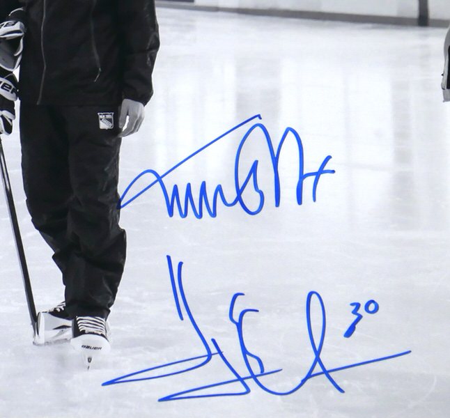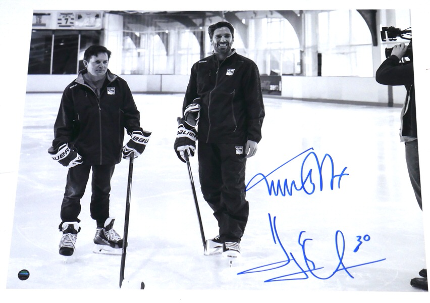 The featured 11 x 14 Photo has been signed by New York Rangers Hall of Famer Henry Lunqvist and legendary actor Michael J Fox. As part of MSG (Madison Square Garden, NY) Network Series titled, “The Mask with Henrik Lundqvist,” the former world-famous goaltender for the New York Rangers featured some celebrity friends, who designed unique, one-of-a-kind helmets that Lundqvist wore during games throughout the 2015 season. Afterwards, the mask was donated to The Garden Of Dreams Foundation, a non-profit organization that works with The Madison Square Garden Company to positively impact the lives of children facing obstacles. Amongst those special guests were actor Michael J. Fox. The Photo includes an official Steiner hologram for authenticity purposes.
