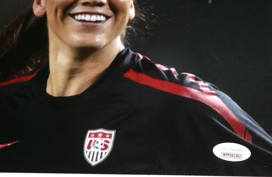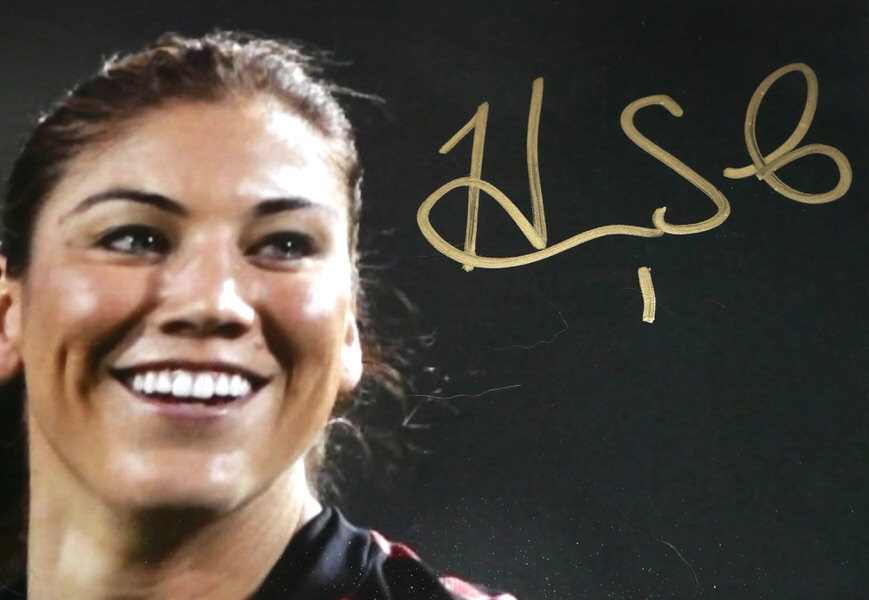 The featured 8 x 10 has been signed in gold by the top female goalkeeper of all time, Hope Solo. The Photo includes an official James Spence Authentication (JSA) hologram and matching COA for authenticity purposes. The signing of this item was witnessed by JSA.