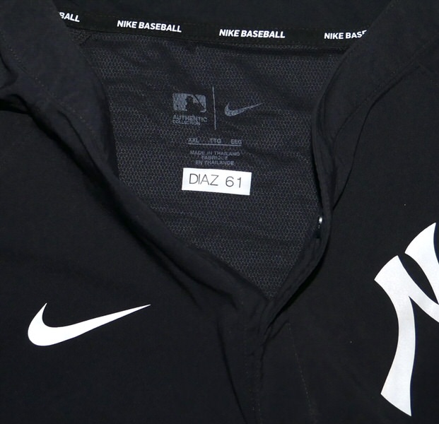 The featured official New York Yankees Short Sleeve Nike XXL Pullover was issued to and worn in batting practice by Indigo Diaz in 2025 as a member of the Somerset Patriots. The Somerset Patriots are an American Minor League Baseball team based in Bridgewater Township, New Jersey, that is the Double-A affiliate of the New York Yankees. In 2025, Diaz went 8-3 with a 2.58 ERA. There is a New York Yankees player issued “DIAZ 61” in the collar area of the Pullover. The Pullover shows some wear and is unsigned. The Pullover was obtained directly from Indigo Diaz!