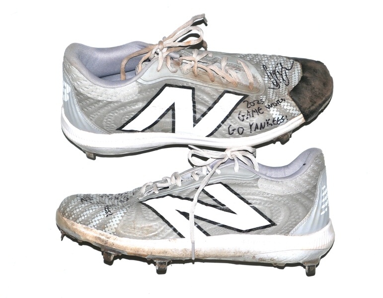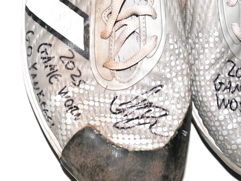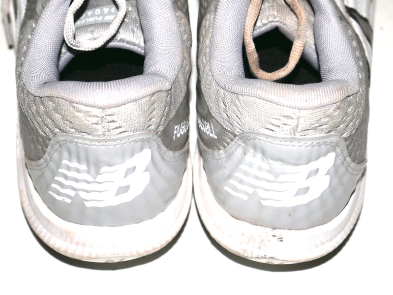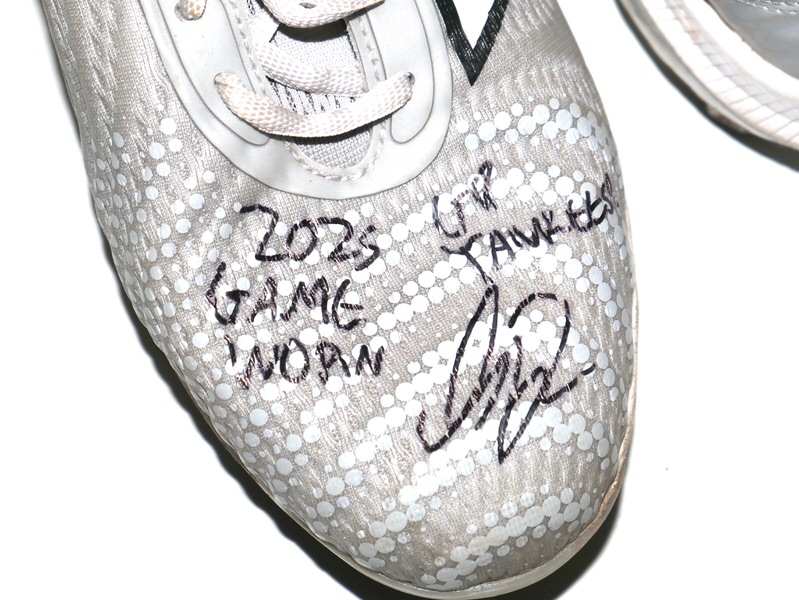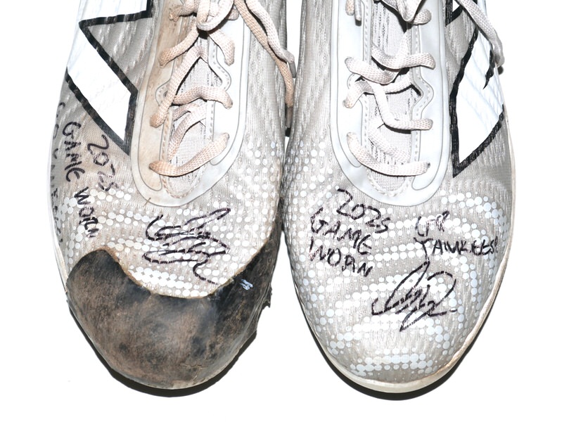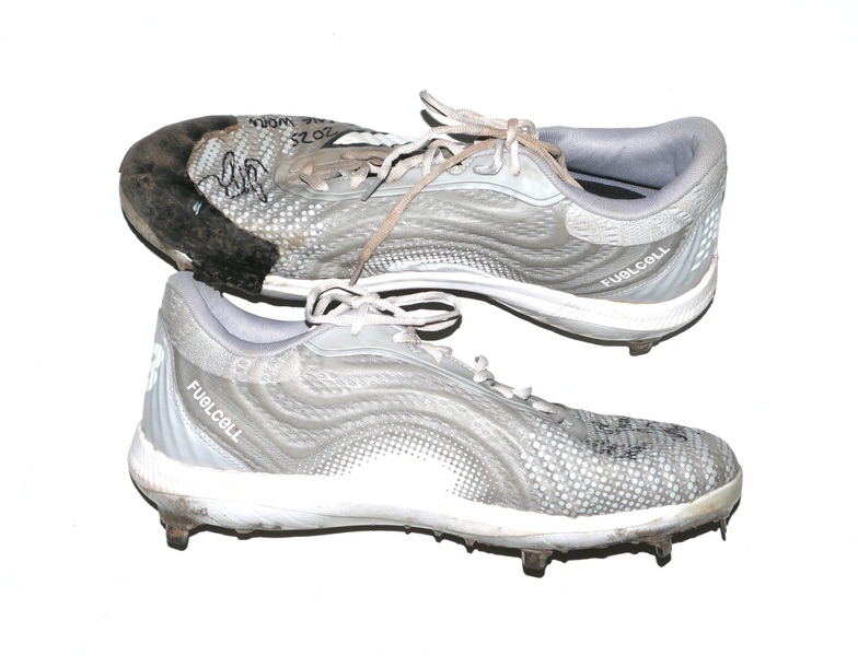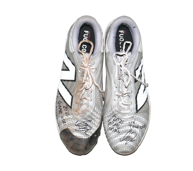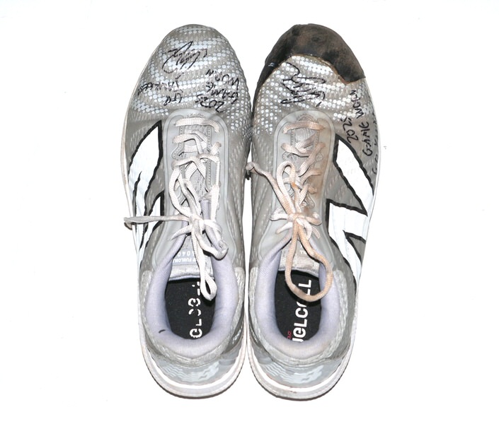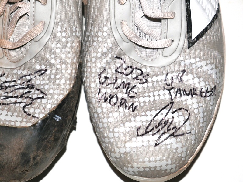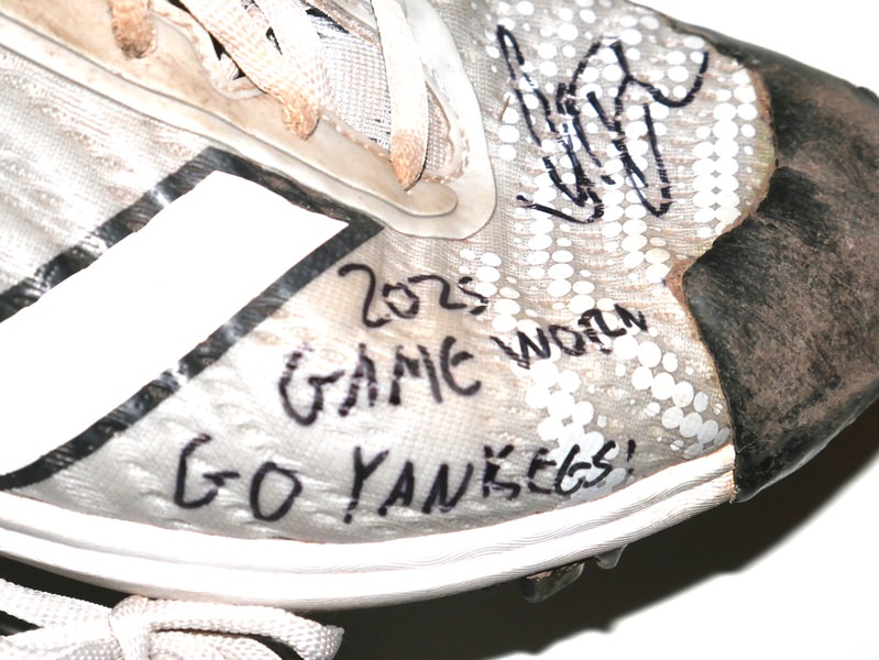 Indigo Diaz 2025 Somerset Patriots Game Worn & Signed “GO YANKEES!” Grey & White New Balance FuelCell Baseball Cleats