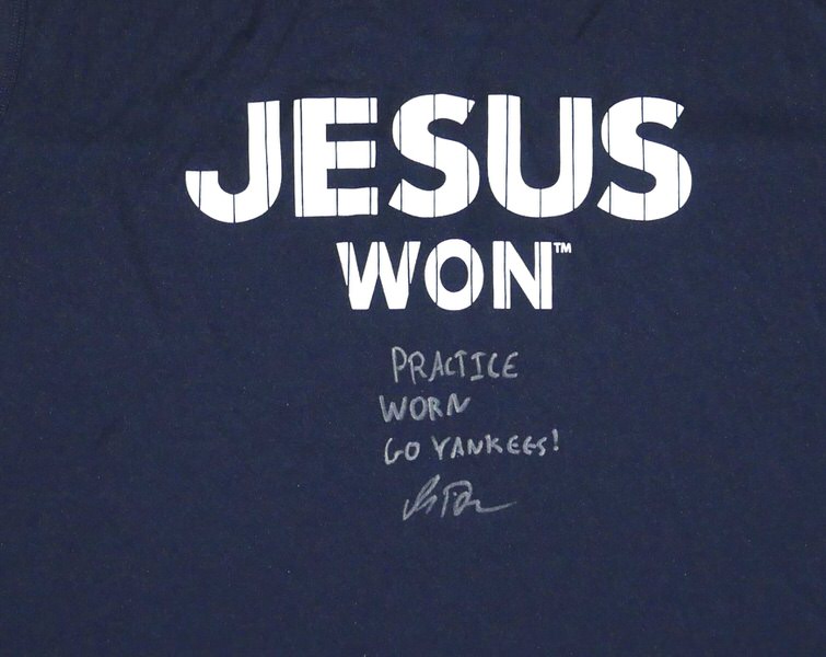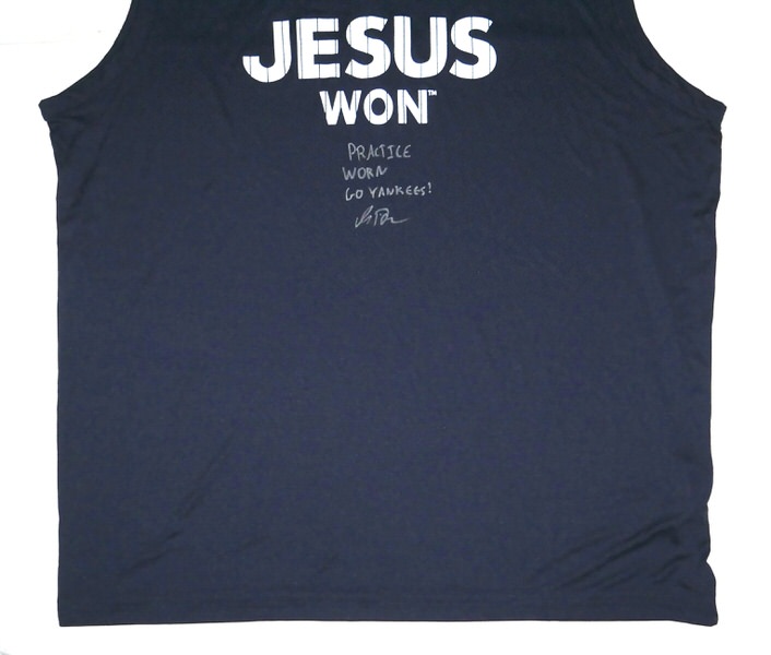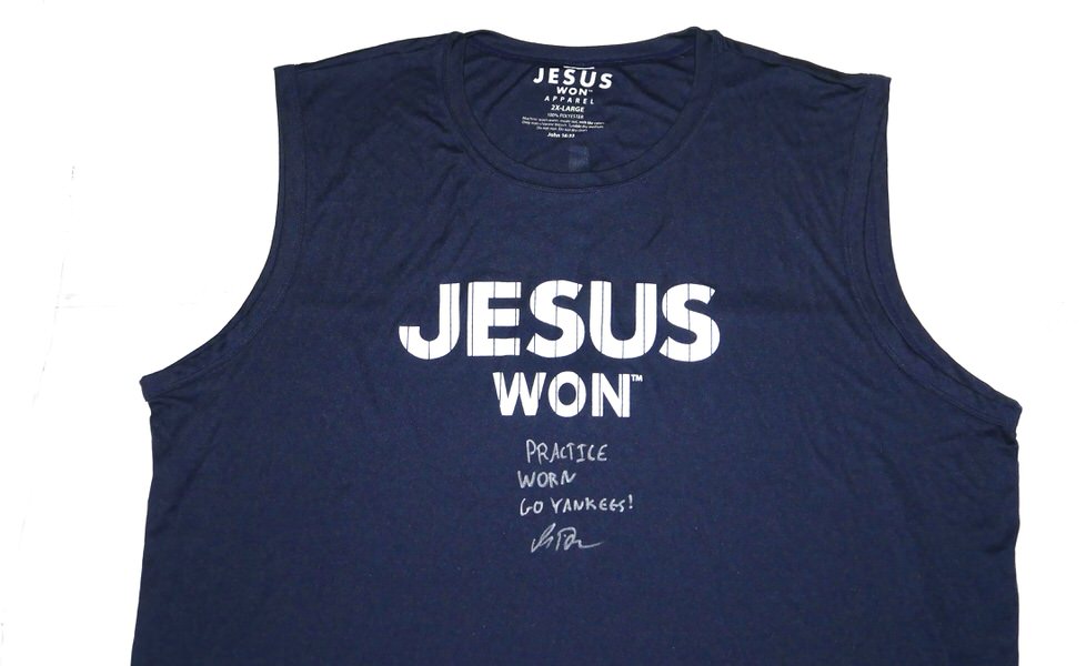 The featured official “JESUS WON” Sleeveless XXL Shirt was worn in practice by Indigo Diaz in 2025 as a member of the Somerset Patriots. The Somerset Patriots are an American Minor League Baseball team based in Bridgewater Township, New Jersey, that is the Double-A affiliate of the New York Yankees. In 2025, Diaz went 8-3 with a 2.58 ERA. Diaz signed the Shirt and added “PRACTICE WORN GO YANKEES!” in silver. The Shirt was obtained directly from Indigo Diaz!