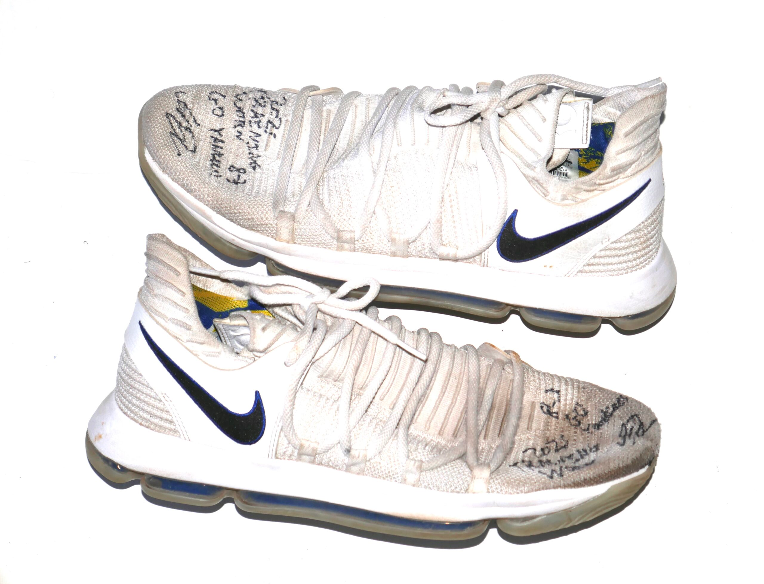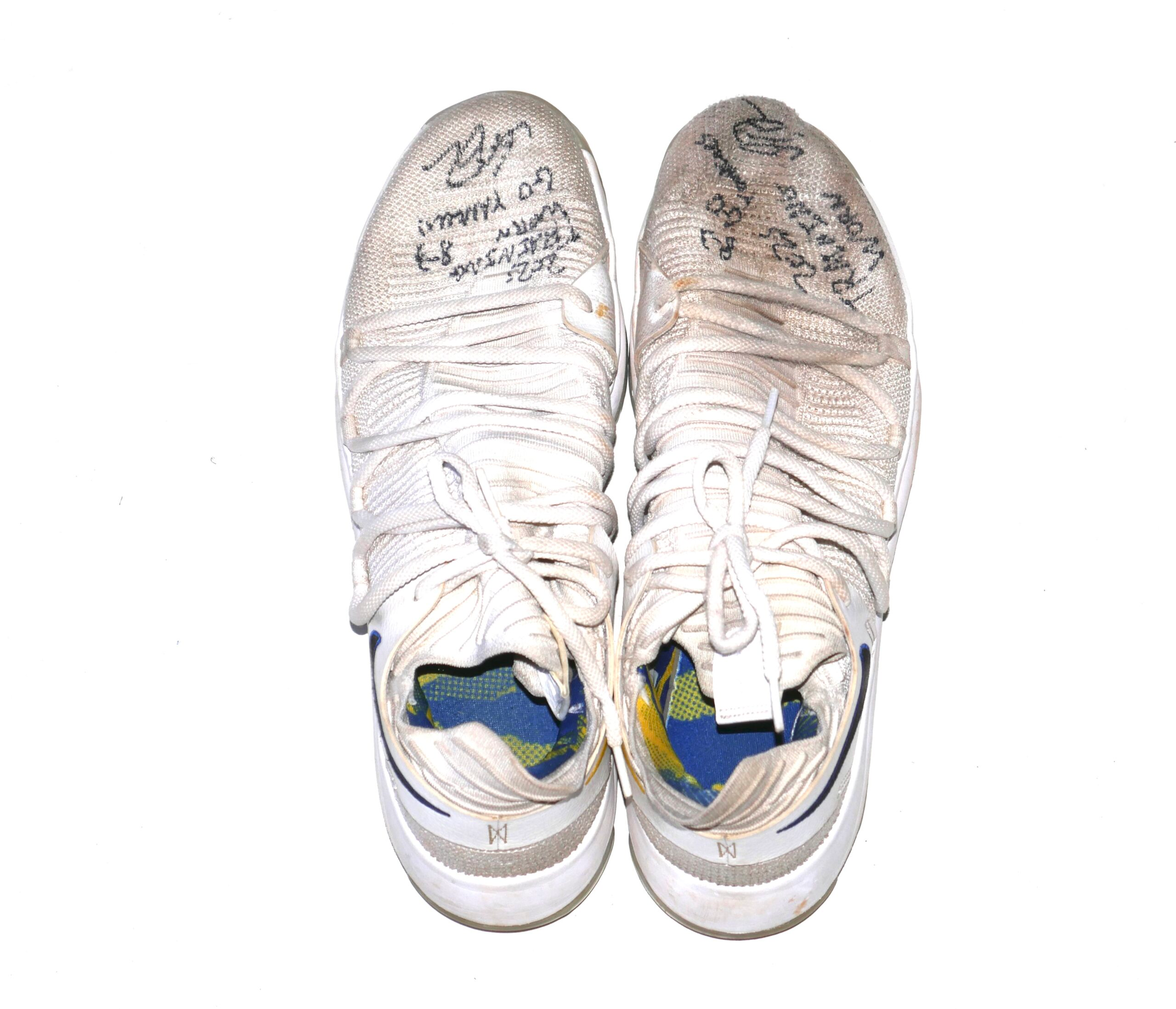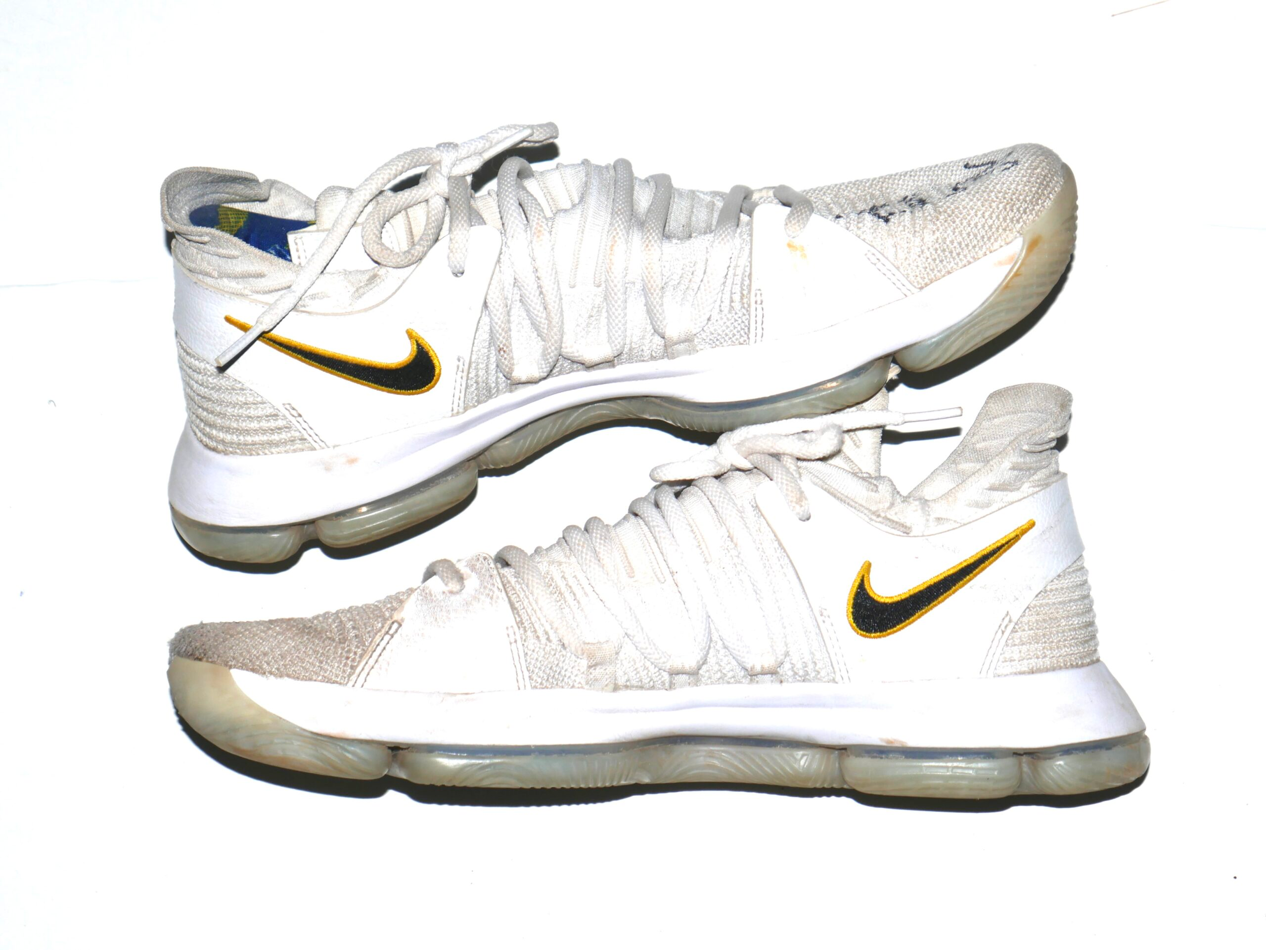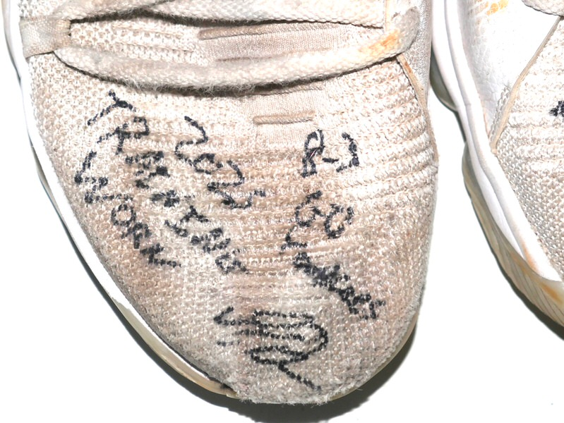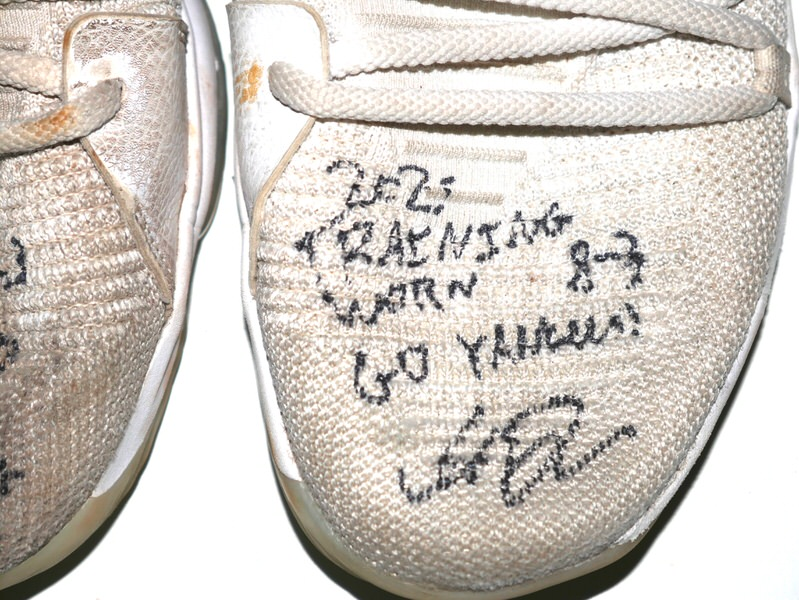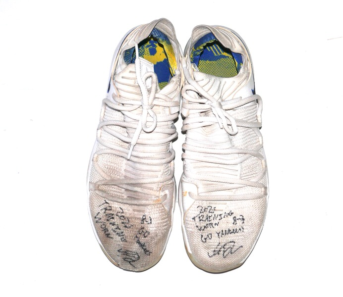 The featured white, gold and black Nike Shoes were worn in training by Indigo Diaz in 2025 as a member of the Somerset Patriots. The Somerset Patriots are an American Minor League Baseball team based in Bridgewater Township, New Jersey, that is the Double-A affiliate of the New York Yankees. In 2025, Diaz went 8-3 with a 2.58 ERA. Diaz signed the Shoes and added “2025 TRAINING WORN 8-3 GO YANKEES!” in black. The Shoes show good wear and were obtained directly from Indigo Diaz!