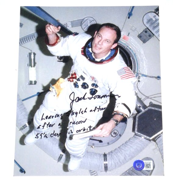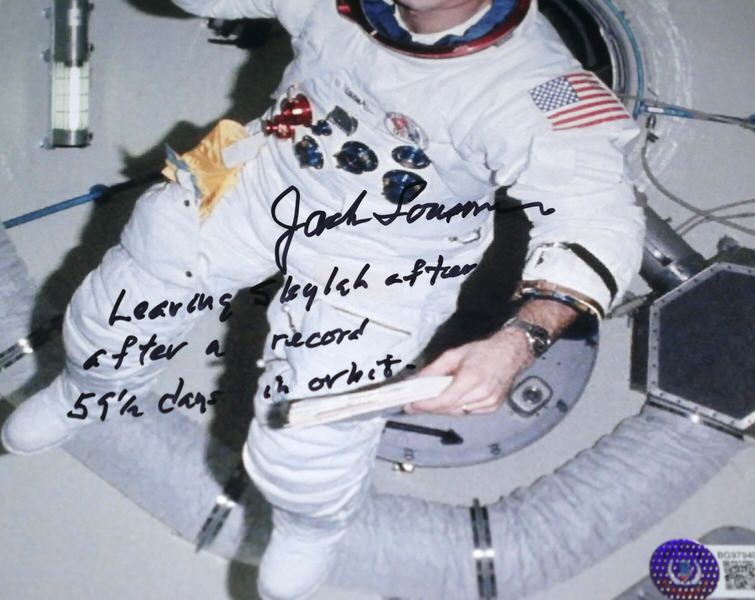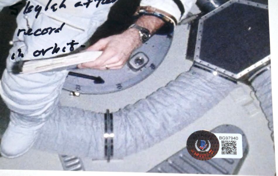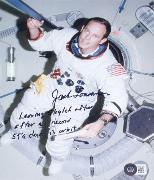 The featured 8 x 10 Photo has been signed by NASA Astronaut Jack Lousma in black. Lousma participated in the record-breaking Skylab 3 Mission which lasted 59 days, 11 hours in space. Lousma added an awesome inscription: “Leaving Skylab after after a record 59 1/2 days in orbit” in black. ( He accidentally wrote “after” twice) The Photo includes an official Beckett Authentication Services serially numbered hologram for authenticity purposes. Awesome Signed Photo for a Fan of NASA and Space!!