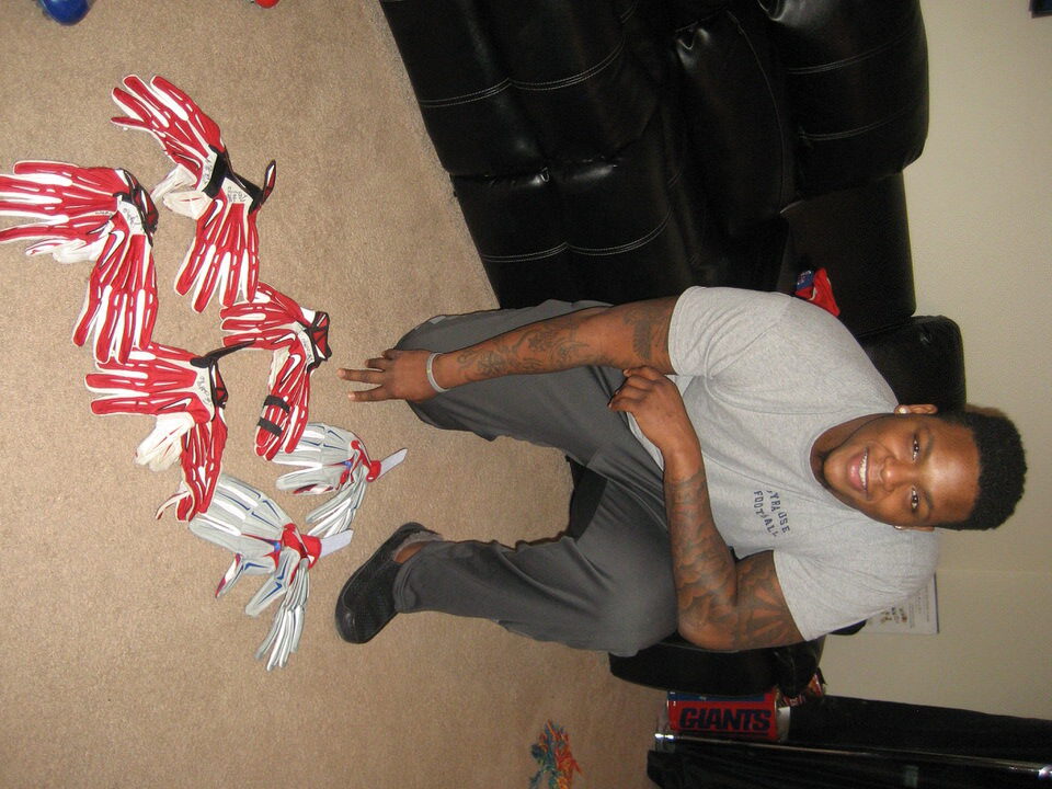 The featured red and white nike 3xl gloves were game worn by Jay Bromley as a member of the New York Giants. The gloves have been signed by Jay Bromley in black and he has added “Game Worn” to the left one. There are two fingers taped up on the left glove and they show great use!