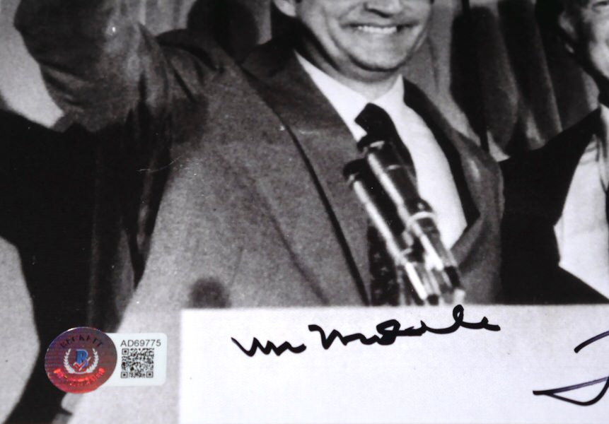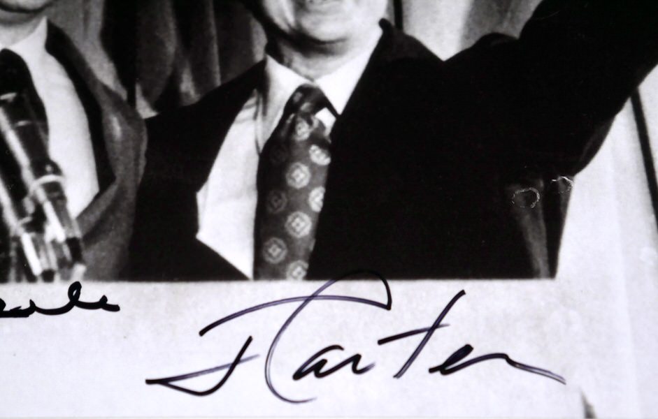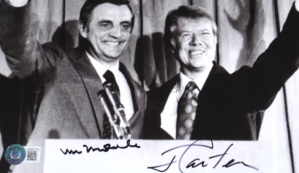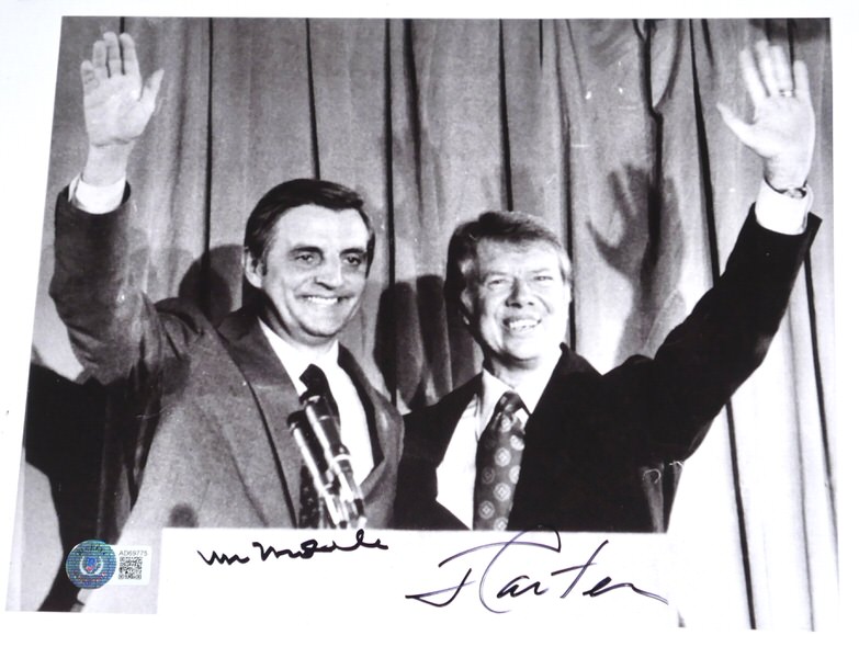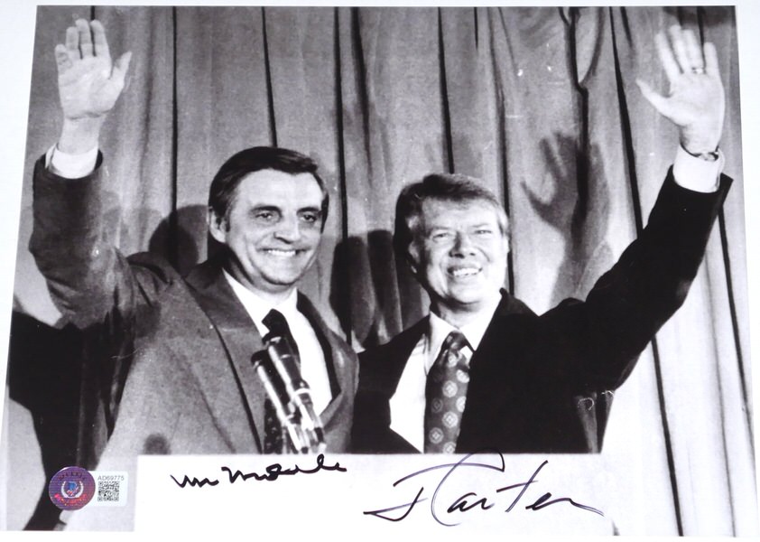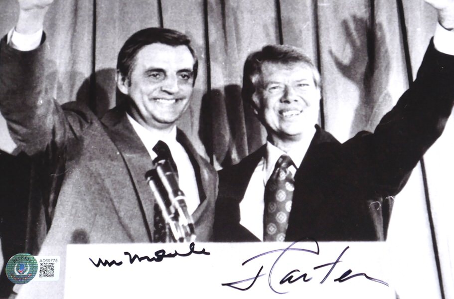 Featured is an 8 x 10 Photo signed in black by the 39th President of the United States Jimmy Carter and his Vice President Walter Mondale. The Carter–Mondale ticket narrowly defeated the Republican ticket of incumbent president Gerald Ford and his running mate Bob Dole. The Photo includes an official Beckett Authentication Services hologram and matching LOA for authenticity purposes.