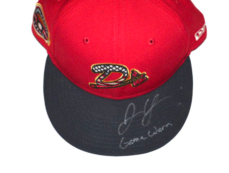 The featured official Danville Braves July 4th New Era 59FIFTY Hat was game worn by Justin Yeager in 2019 as a member of the Braves. The Danville Braves were a Minor League Baseball team in Danville, Virginia. They were an Advanced Rookie-level team in the Appalachian League and were a farm team of the Atlanta Braves. In 2019 with Danville, Yeager went 2-2 with a 4.24 ERA in 14 Games. The talented right-hander signed the Hat and added “Game Worn” in silver. The Hat measures 7 1/2 and was obtained directly from Justin Yeager!!!