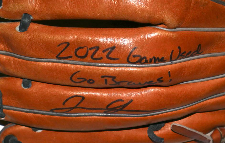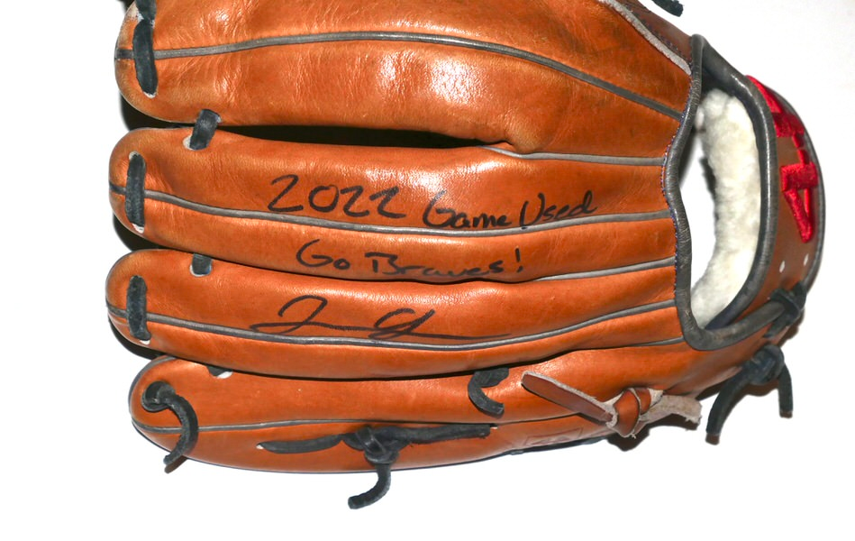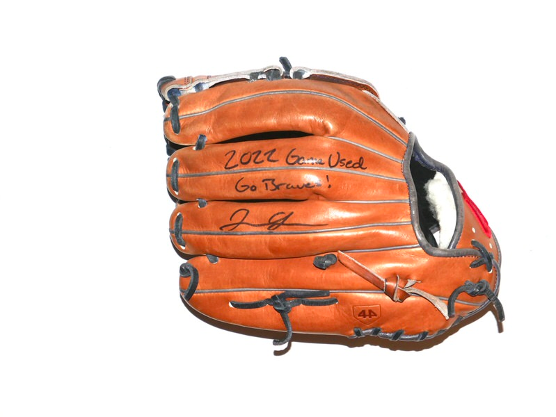 The featured 44 Pro Baseball Glove was game worn by Justin Yeager in 2022 as a member of the Mississippi Braves. The Mississippi Braves were the Double-A affiliate of the Atlanta Braves, playing in Pearl, Mississippi, at Trustmark Park until the end of the 2024 season before relocating to Columbus, Georgia. They were known as the “M-Braves,” won Southern League championships, and served as a key development team for the Atlanta Braves organization for nearly two decades. Yeager signed the Glove and added “Game Used Go Braves!” in black. The thumb of the glove is embroidered with “Justin Yeager’ in red. The Glove shows good use and was obtained directly from Justin Yeager!