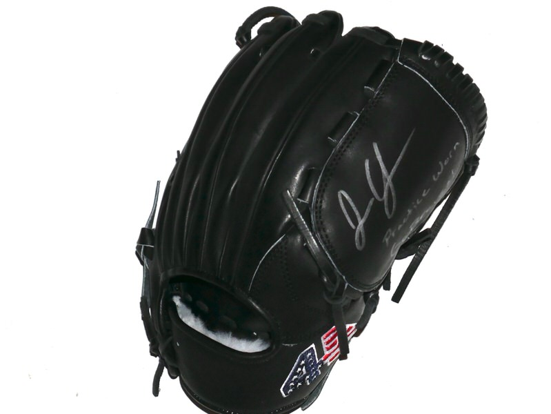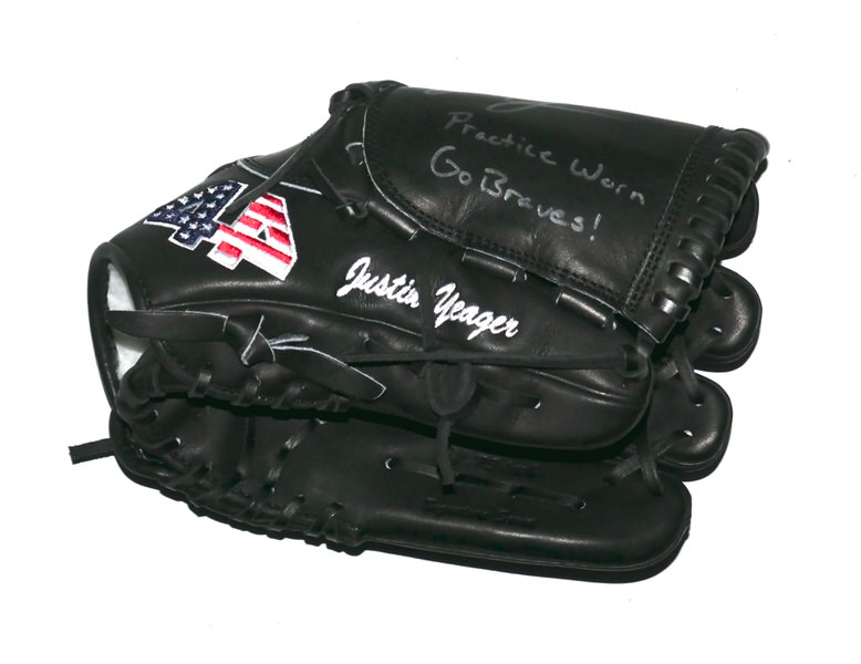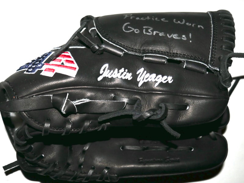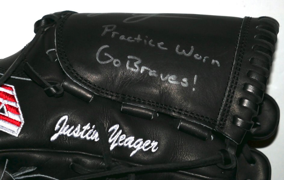 The featured black 44 Pro Baseball Glove was practice worn by Justin Yeager in 2022 as a member of the Mississippi Braves. The Mississippi Braves were the Double-A affiliate of the Atlanta Braves, playing in Pearl, Mississippi, at Trustmark Park until the end of the 2024 season before relocating to Columbus, Georgia. They were known as the “M-Braves,” won Southern League championships, and served as a key development team for the Atlanta Braves organization for nearly two decades. Yeager signed the Glove and added “Practice Worn Go Braves!” in silver. The Glove shows very light use and was obtained directly from Justin Yeager!