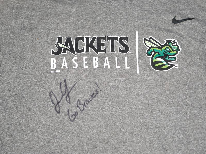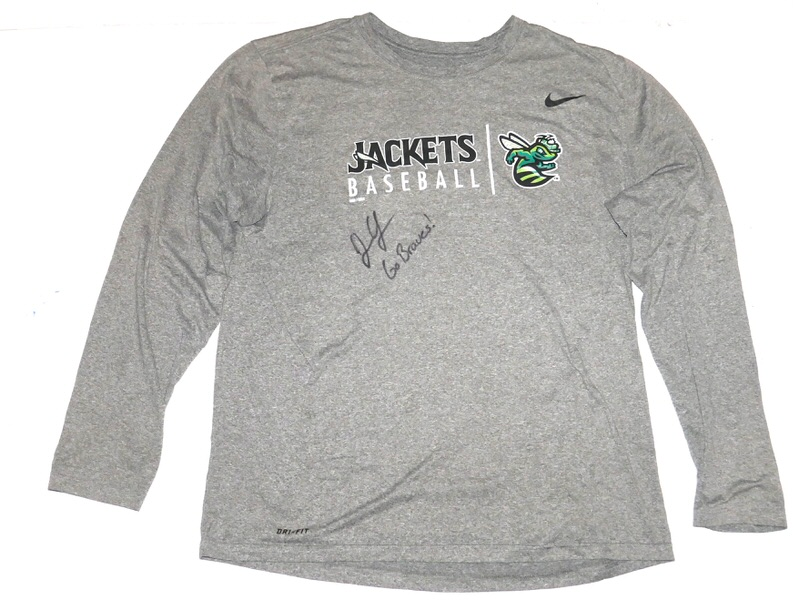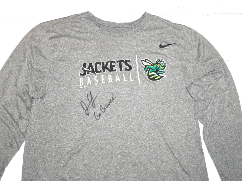 The featured official grey Augusta GreenJackets Baseball Long Sleeve Nike Dri-Fit XL Shirt was worn in practice by Justin Yeager in 2021 as a member of the GreenJackets. The Augusta GreenJackets are a Minor League Baseball team of the Carolina League and the Single-A affiliate of the Atlanta Braves. They play their home games at SRP Park in North Augusta, South Carolina. In 2021, Yeager pitched in 17 games for Augusta and went 5-0 with a 3.27 ERA. The talented right-hander signed the Shirt and added “Go Braves!” in black. The Shirt was obtained directly from Justin Yeager!