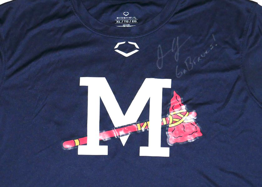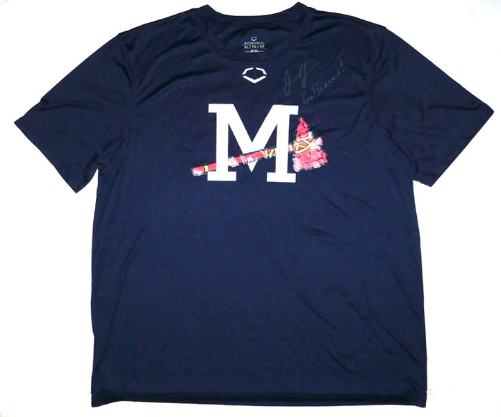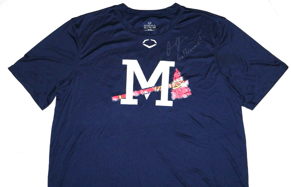 The featured official blue Mississippi Braves #39 EvoShield XL Shirt was issued to and worn in practice by Justin Yeager in 2022 as a member of the Mississippi Braves. The Mississippi Braves were the Double-A affiliate of the Atlanta Braves, playing in Pearl, Mississippi, at Trustmark Park until the end of the 2024 season before relocating to Columbus, Georgia. They were known as the “M-Braves,” won Southern League championships, and served as a key development team for the Atlanta Braves organization for nearly two decades. In 2022, Yeager pitched in 38 games for the M-Braves and had a 1-0 Record with a 3.79 ERA. He recorded a 1.21 WHIP and added 6 Holds and 6 saves in 6 opportunities. Yeager signed the Shirt and added “Go Braves!” in silver. The Shirt was obtained directly from Justin Yeager!