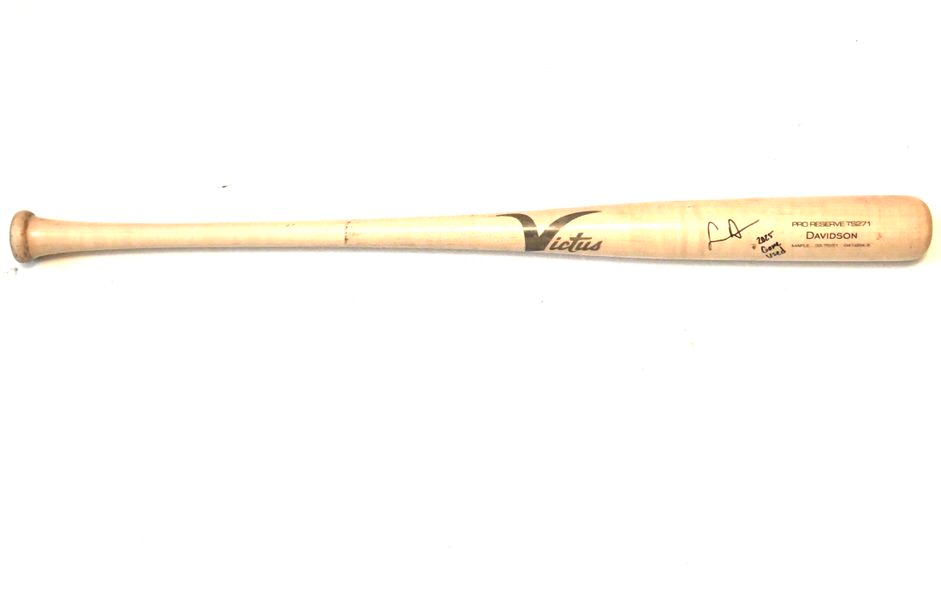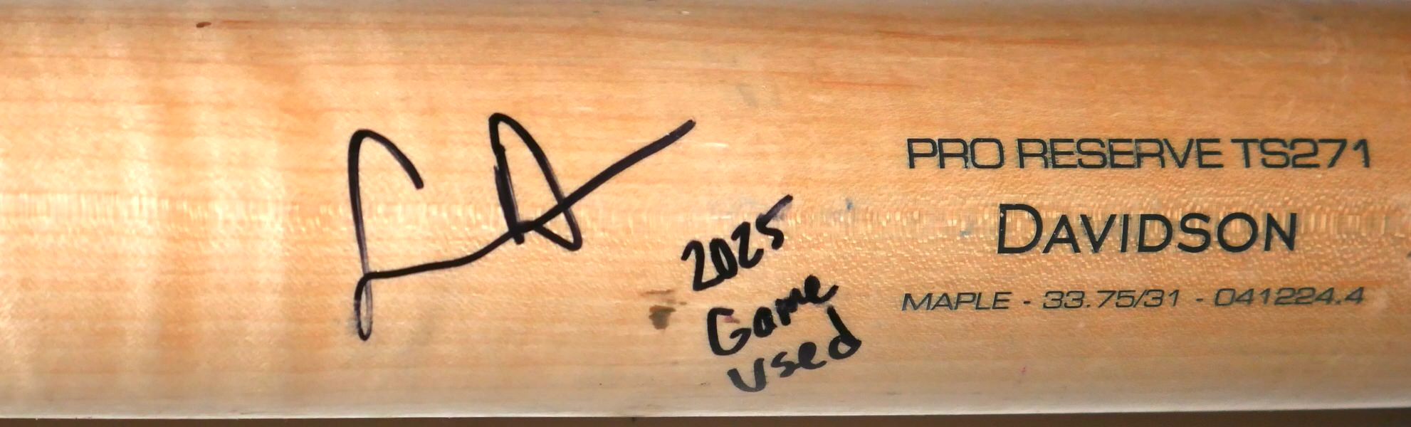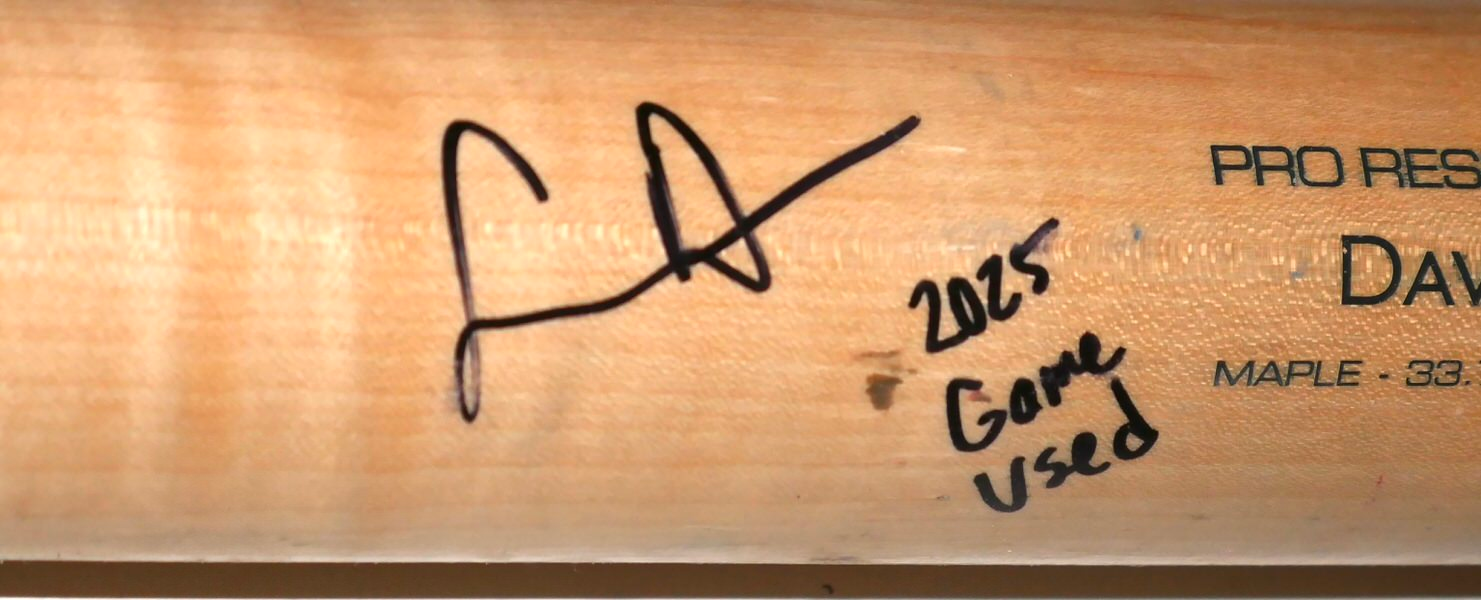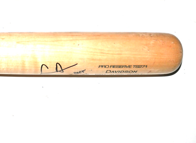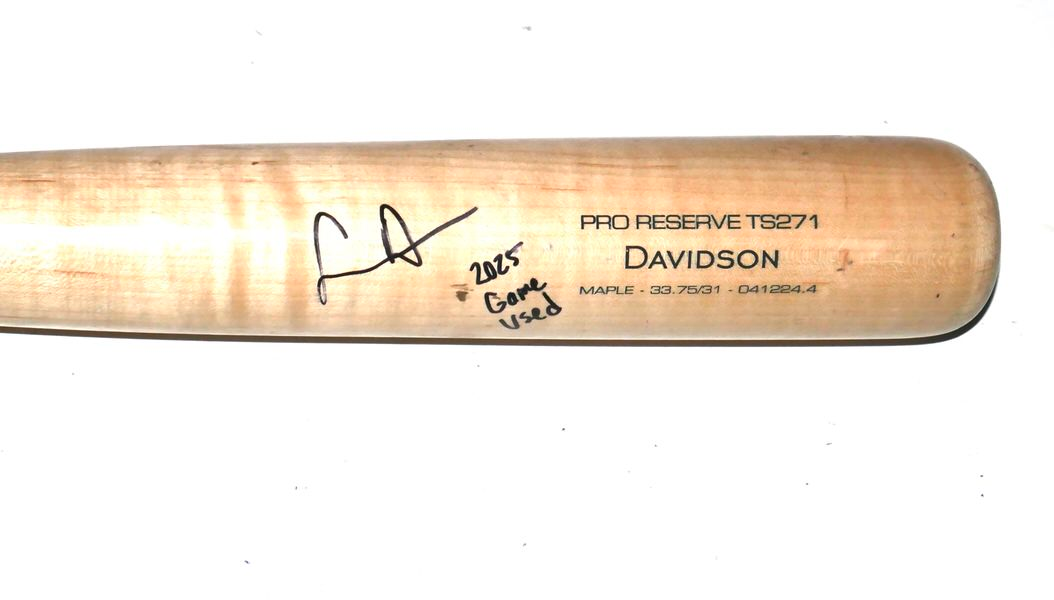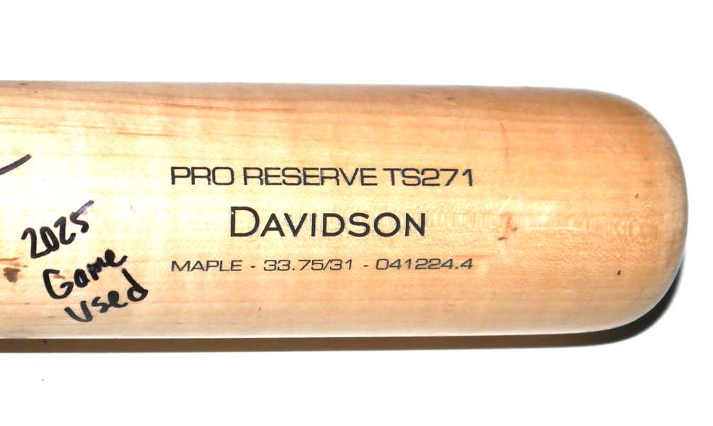 The featured Victus TS271 Maple Baseball Bat was game used by Logan Davidson in 2025 as a member of the Las Vegas Aviators. The Las Vegas Aviators, formerly known as the Las Vegas 51s and Las Vegas Stars, are a Minor League Baseball team of the Pacific Coast League and the Triple-A affiliate of the Oakland Athletics. They are located in Summerlin South, Nevada, a community in Las Vegas. In 2025, Davidson played in 73 games with the Aviators and hit .263 with a .412 On Base Percentage!! Davidson signed the Bat and added “2025 Game Used” in black. The Bat is CRACKED and shows light use. The Bat was obtained directly from Logan Davidson!!!