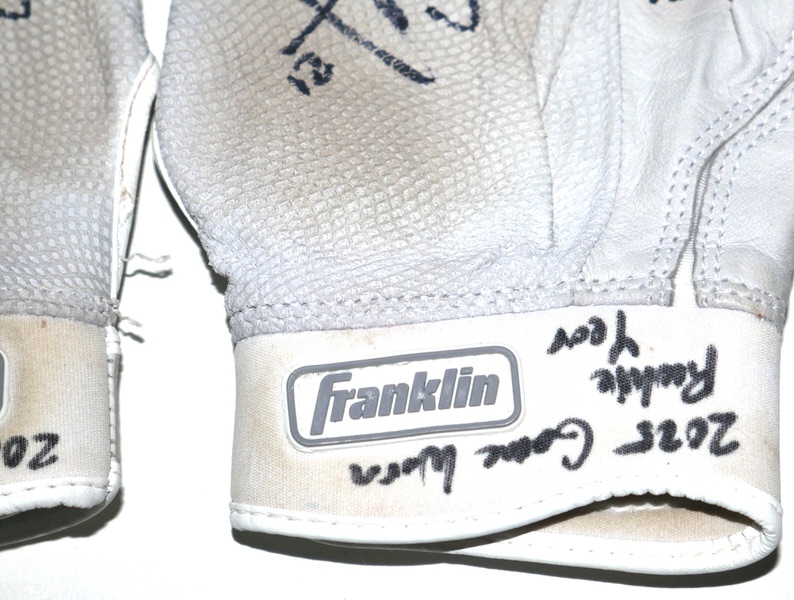 The featured Franklin Batting Gloves were game worn by Logan Davidson in 2025, his rookie season as a member of the Los Angeles Angels. The talented infielder signed the Gloves and added “2025 Game Worn Rookie Year Go Angels!” in black. In 2025, Davidson played in 10 games with the Angels and had 4 Hits in 22 At-Bats. The Gloves show good use and were obtained directly from Logan Davidson!