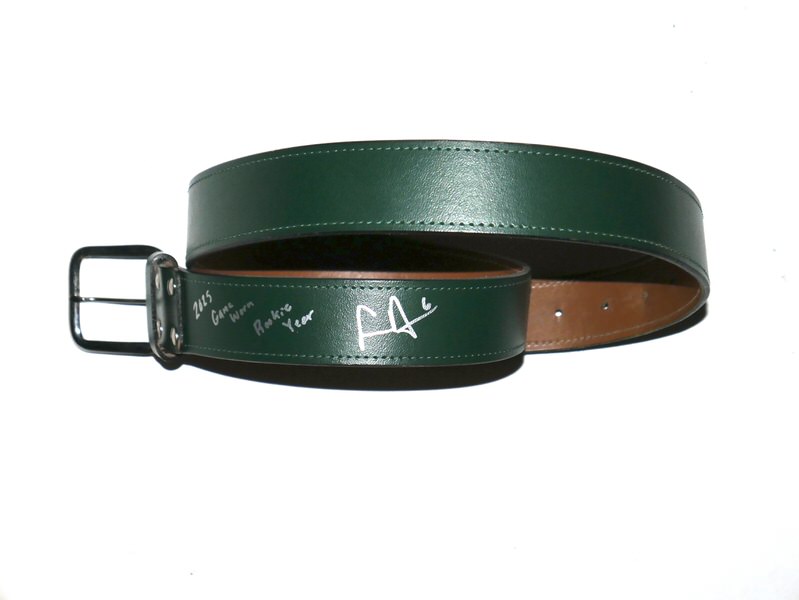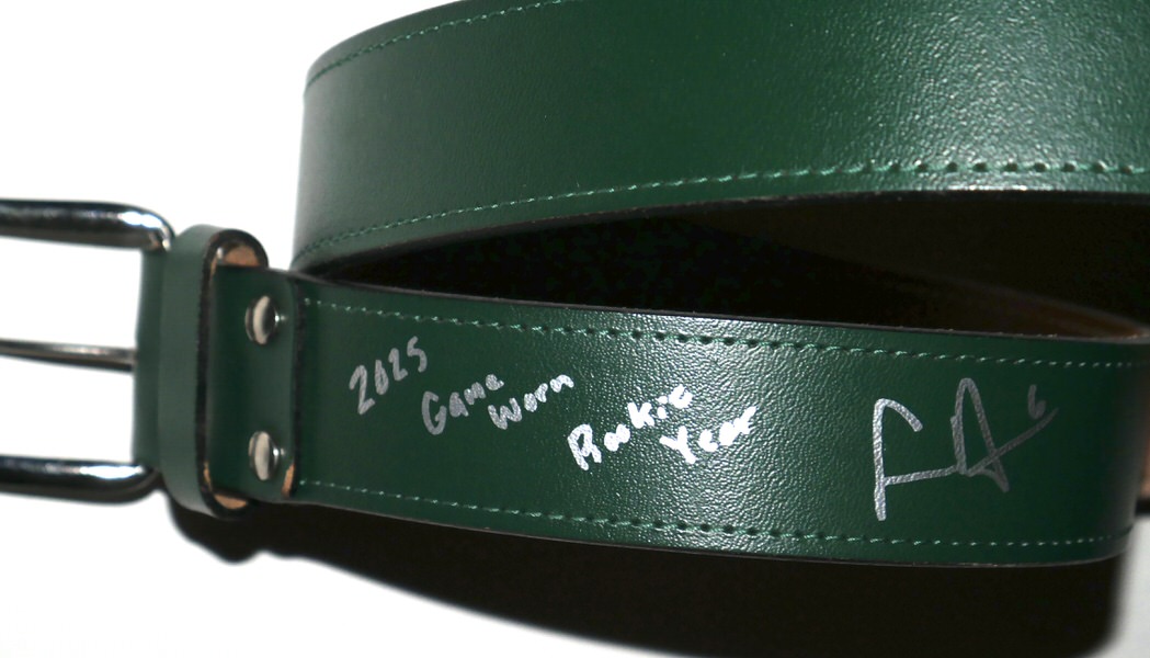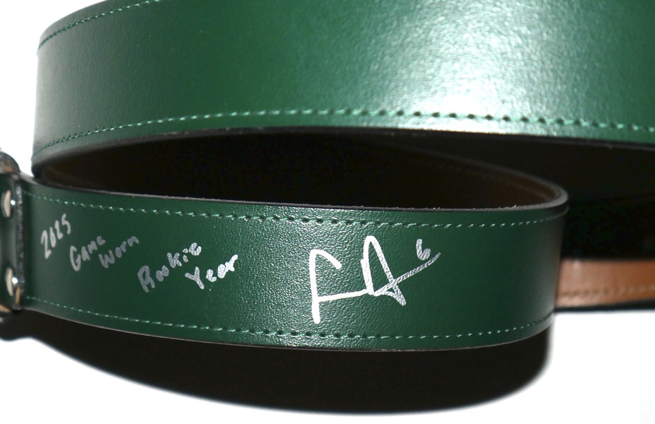 The featured official green Leather Belt was game worn by Logan Davidson in 2025, his rookie season as a member of the Oakland Athletics. Davidson played in 9 games with the Athletics in 2025. The talented infielder signed the Belt and added “Game Worn Rookie Year” in silver. The name “DAVIDSON” is written on the inside of the Belt. The Belt was obtained directly from Logan Davidson!