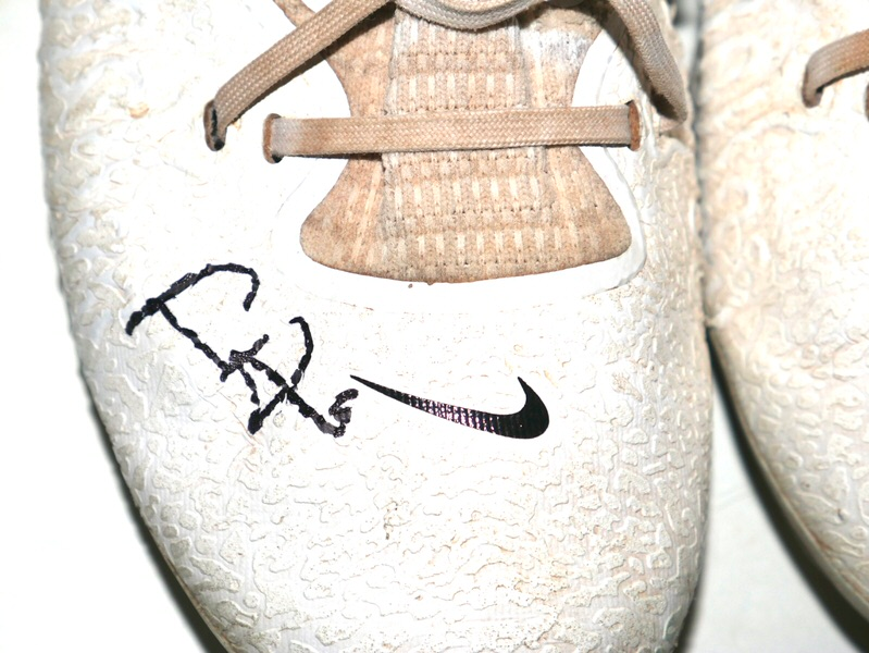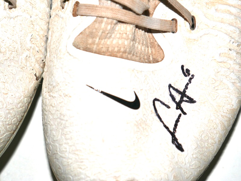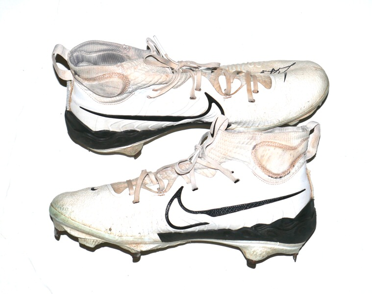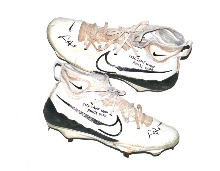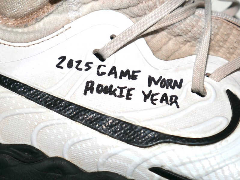 The featured white and black Nike Cleats were game worn by Logan Davidson in 2025, his rookie season as a member of the Oakland Athletics. Davidson played in 9 games with the Athletics in 2025. The talented infielder signed the Cleats and added “2025 Game Worn Rookie Year” in black. The bottom of the Cleats feature the number “20” written in blue. The Cleats show good use and were obtained directly from Logan Davidson!