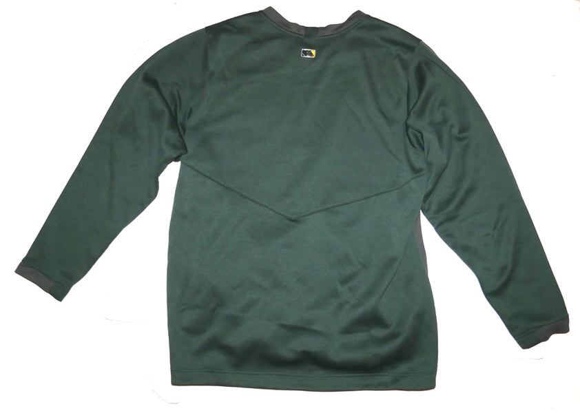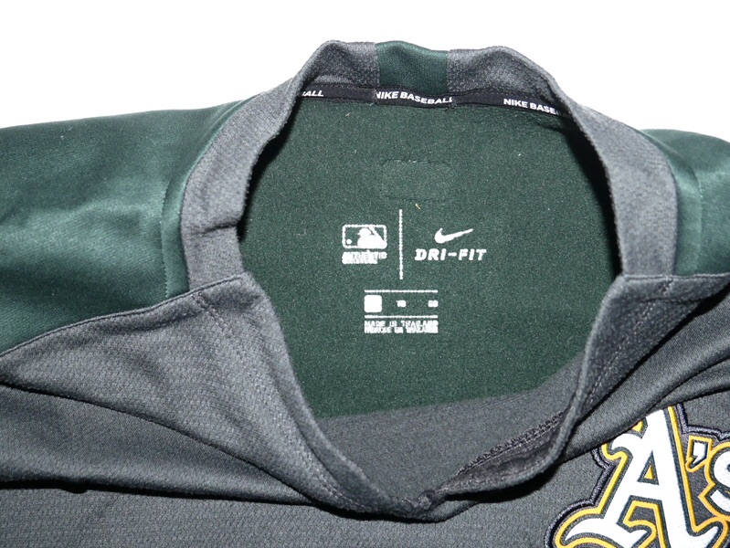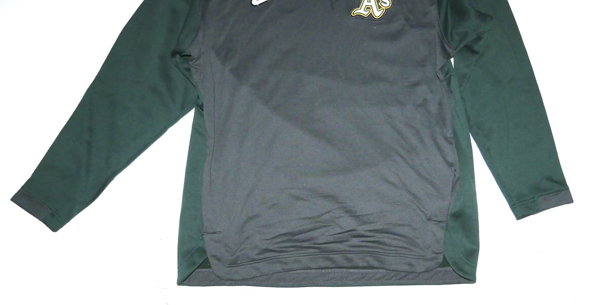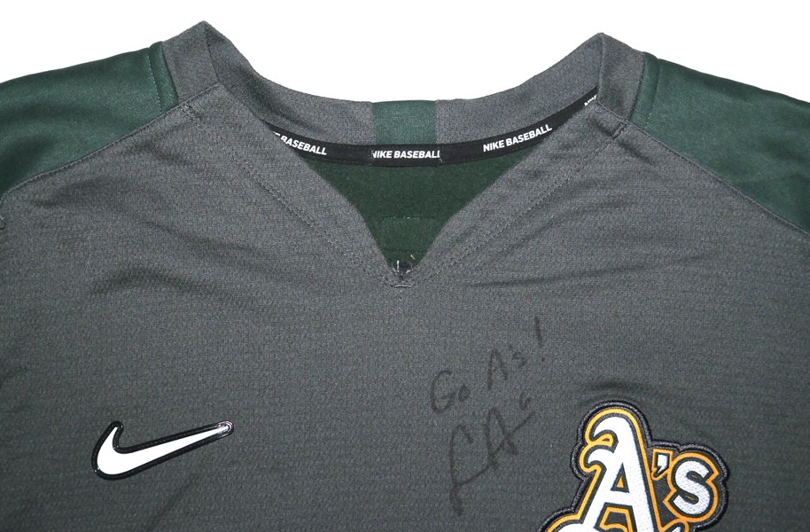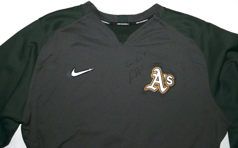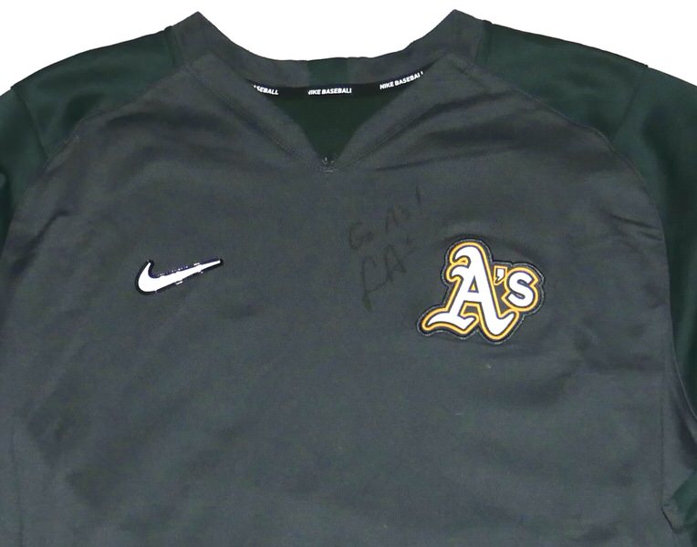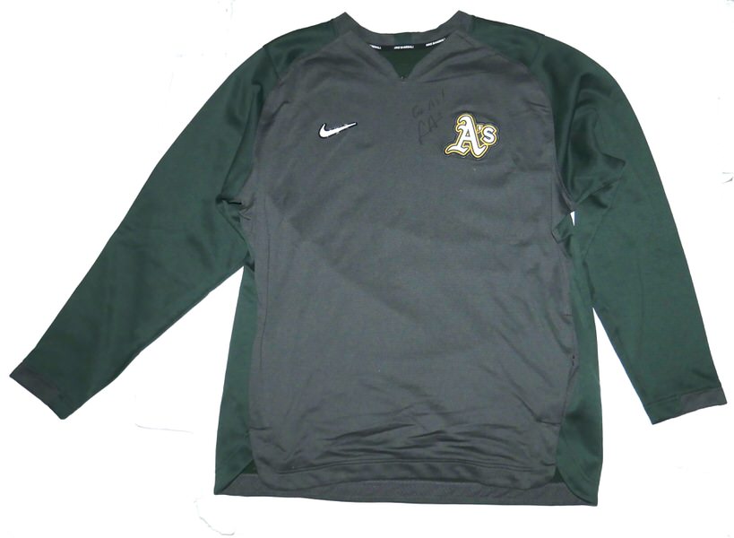 The featured official Oakland Athletics Nike MLB Pullover Sweatshirt was issued to Logan Davidson as a member of the Oakland Athletics. The Sweatshirt was worn in batting practice by Davidson in 2025 as a member of the Las Vegas Aviators. Davidson played in 73 games and hit .263 with 40 RBIs and an .809 OPS. The talented infielder signed the Pullover and added “Go A’s!” in black. The Pullover was obtained directly from Logan Davidson!