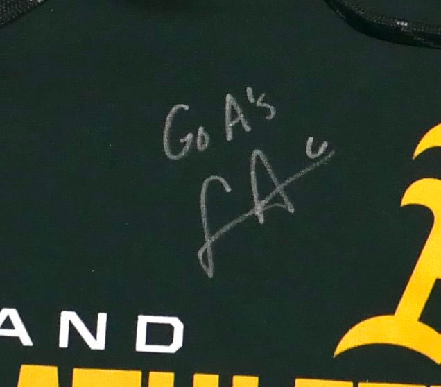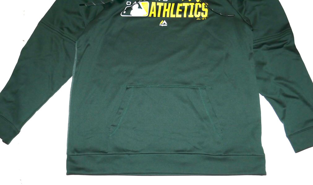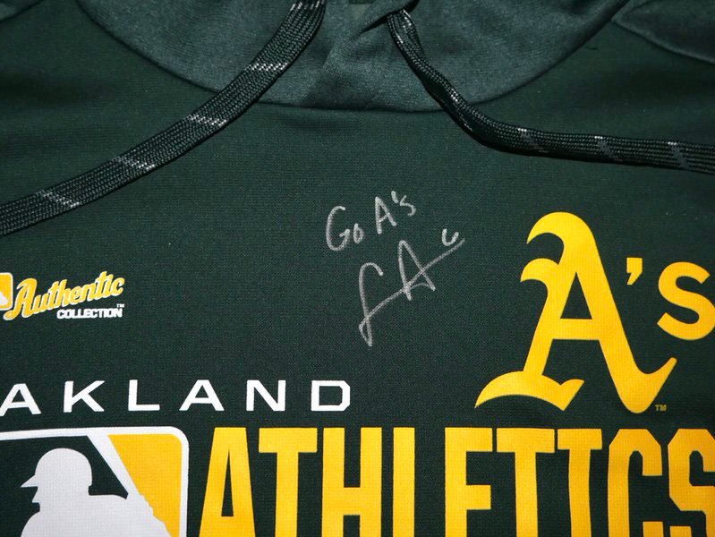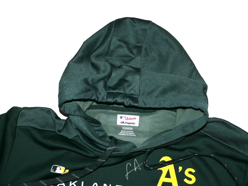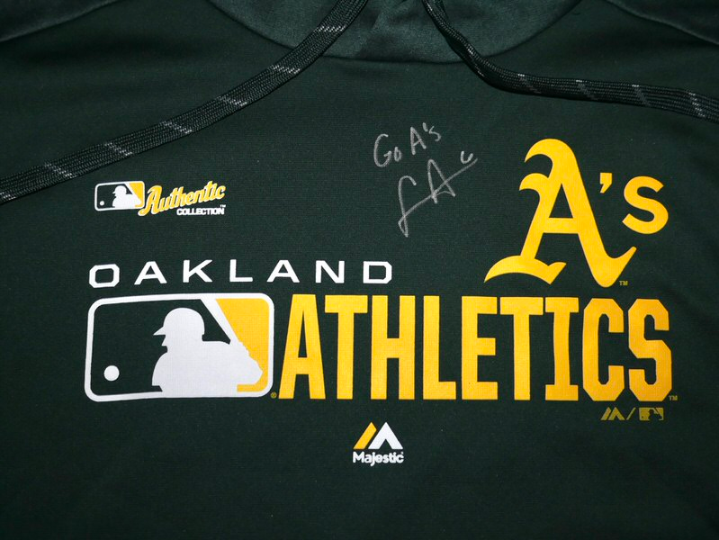 The featured official green and gold Oakland Athletics Majestic Hooded XL Pullover was issued to Logan Davidson as a member of the Oakland Athletics organization. Davidson wore this Pullover in Batting Practice as a member of the Las Vegas Aviators. Davidson played in 73 games and hit .263 with 40 RBIs and an .809 OPS. The talented infielder signed the Pullover and added “Go A’s!” in silver. The Pullover was obtained directly from Logan Davidson!