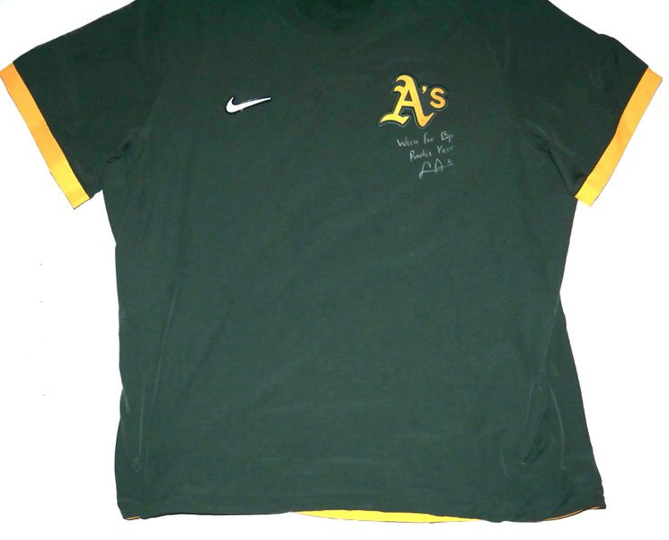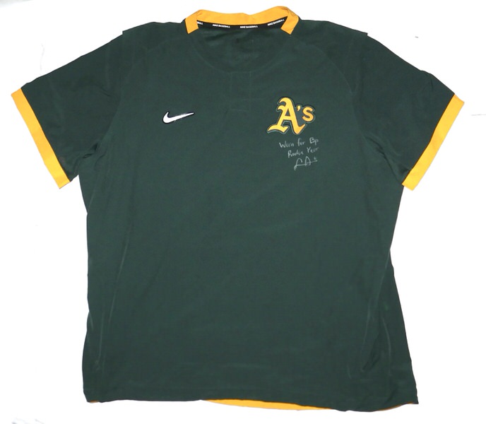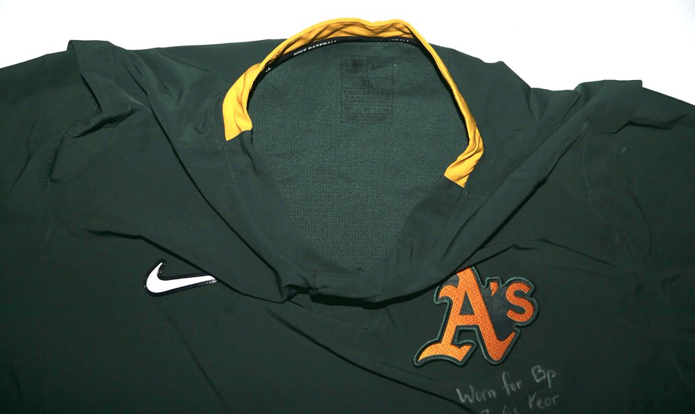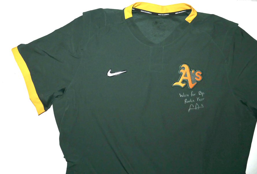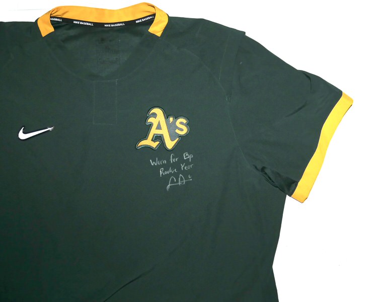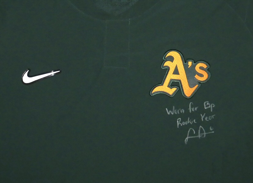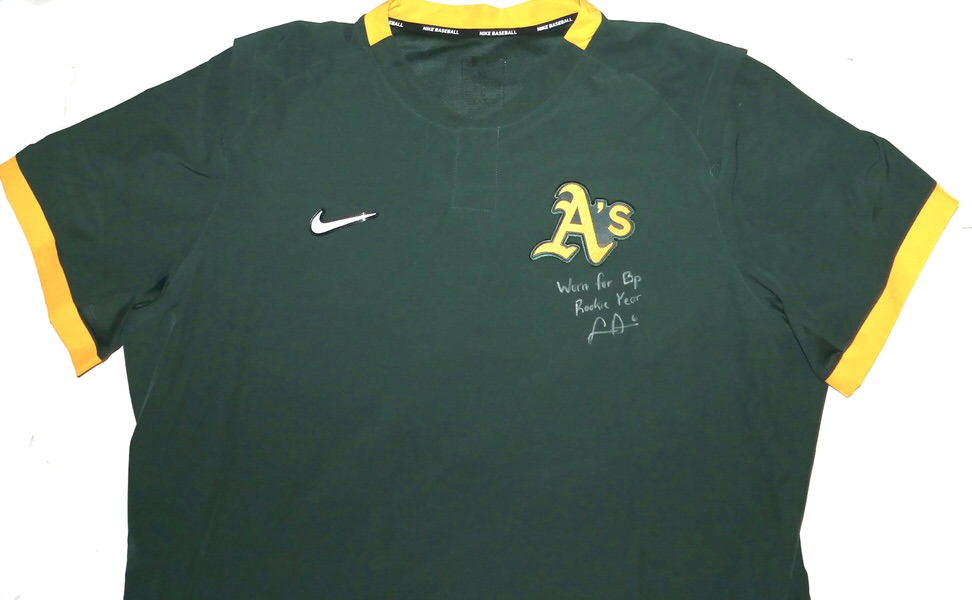 The featured official green and gold Oakland Athletics Nike XL Pullover was issued to and worn by Logan Davidson in Batting Practice in 2025, his rookie season as a member of the Oakland Athletics. Davidson played in 9 games with the Athletics in 2025. The talented infielder signed the Pullover and added “Worn for Bp Rookie Year #6” in silver. The Pullover was obtained directly from Logan Davidson!