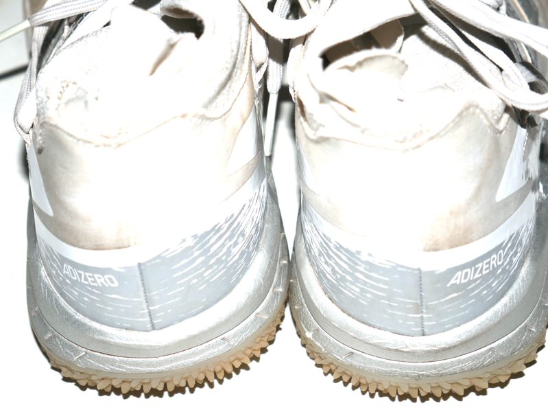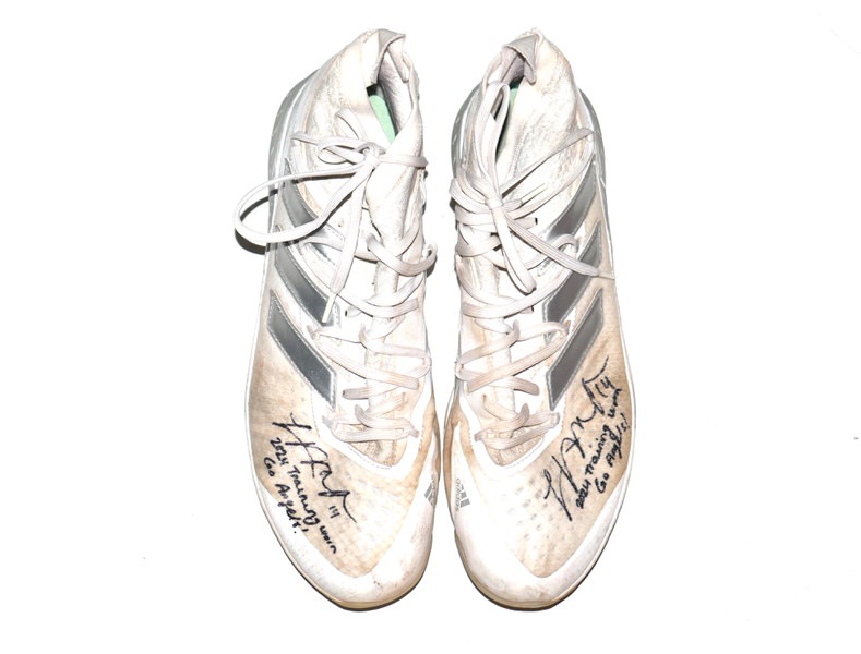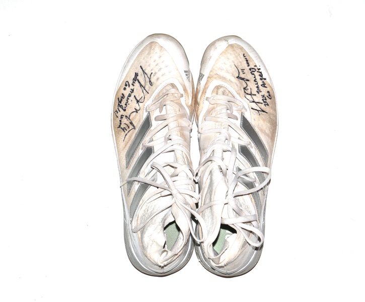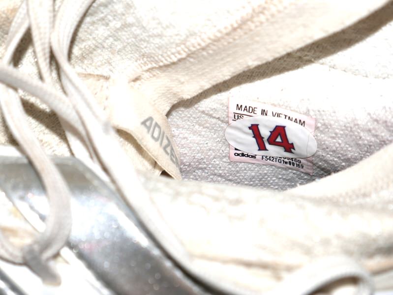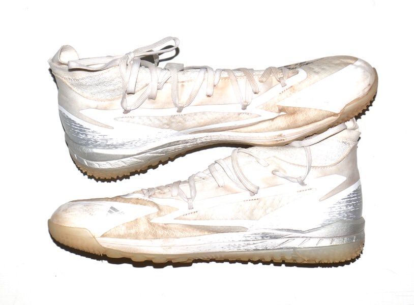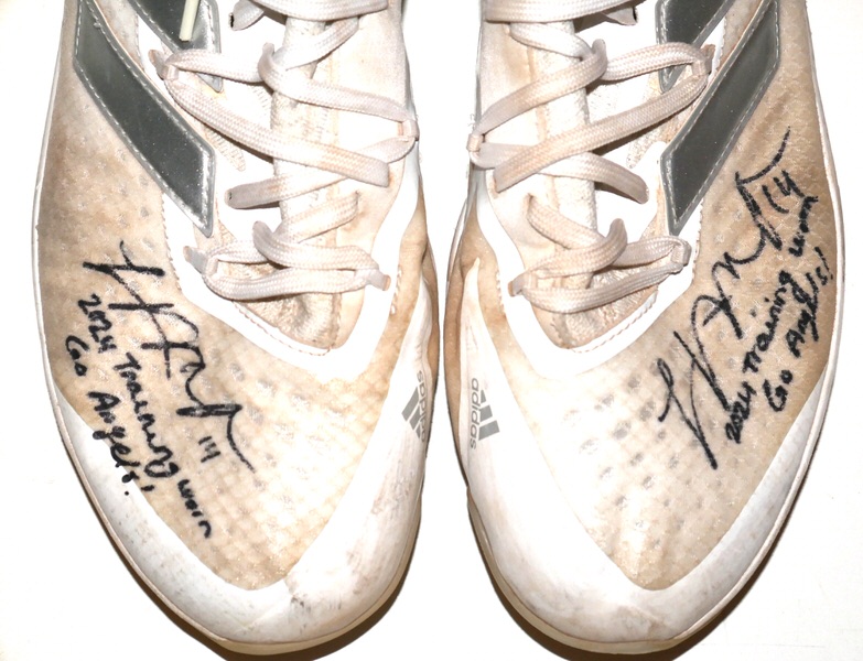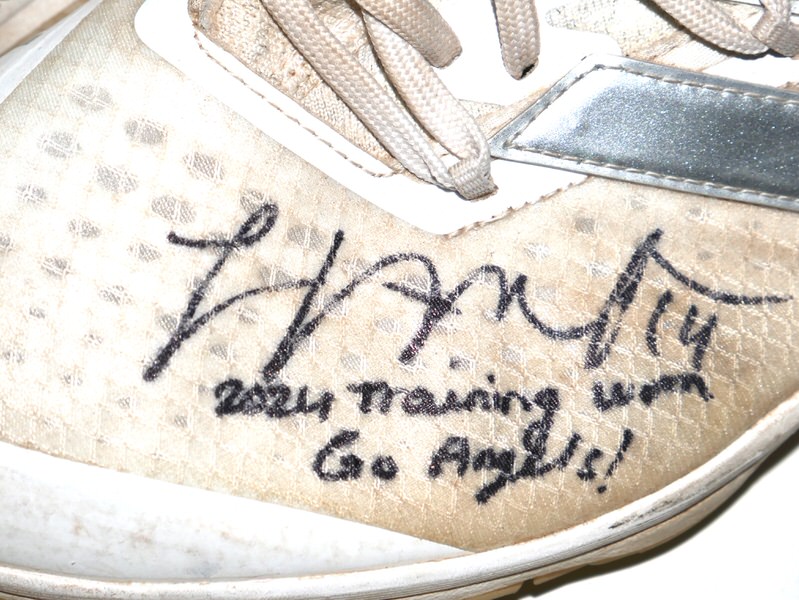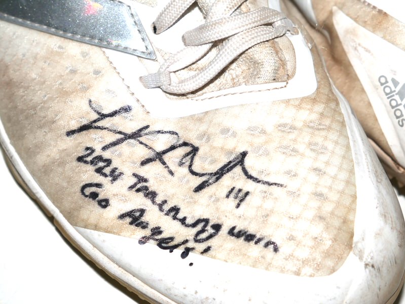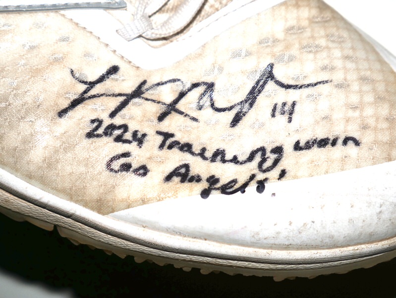 The featured white, tan and silver Adidas Adizero Turf Shoes were worn in training by Logan O’Hoppe in 2024 as a member of the Los Angeles Angels. O’Hoppe played in 136 Games for the Angels and hit 20 Home Runs and knocked in 56 Runs. The talented catcher signed the Shoes and added his number “14” and “2024 Training Worn Go Angels!” in black. There is a Los Angeles Angels player issued “14” label inside each shoe on the size tag. The Shoes show good use and were obtained directly from Logan O’Hoppe! Awesome Training Shoes from one of MLB’s Top Catchers!!!