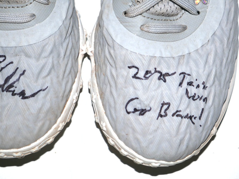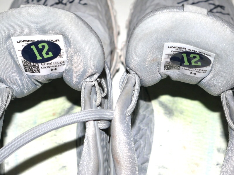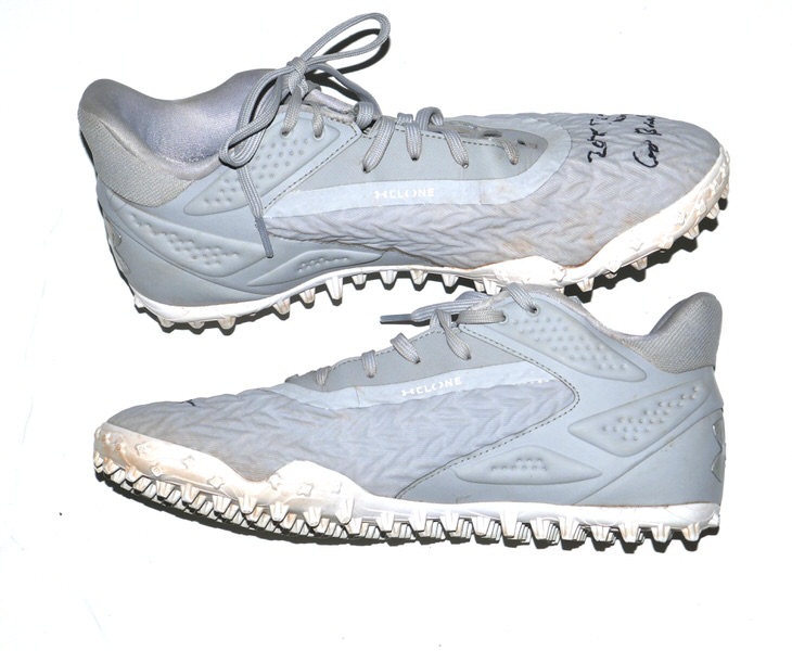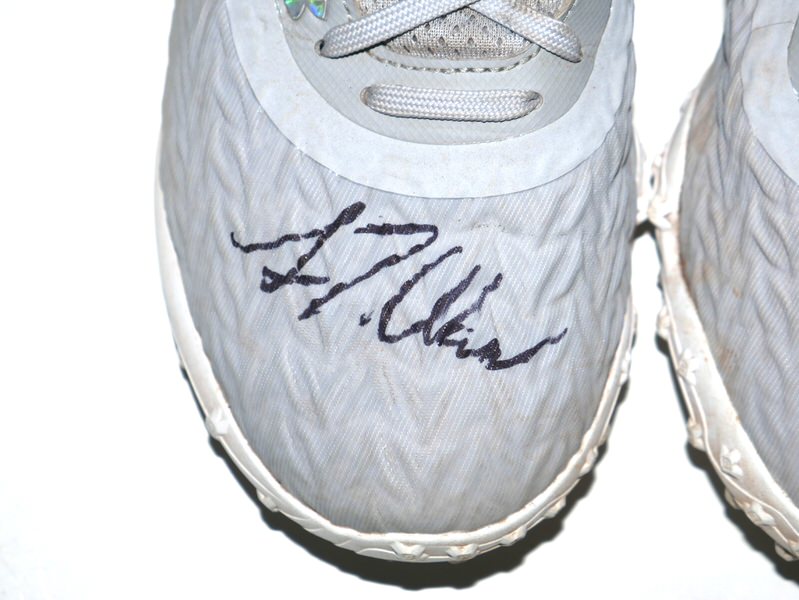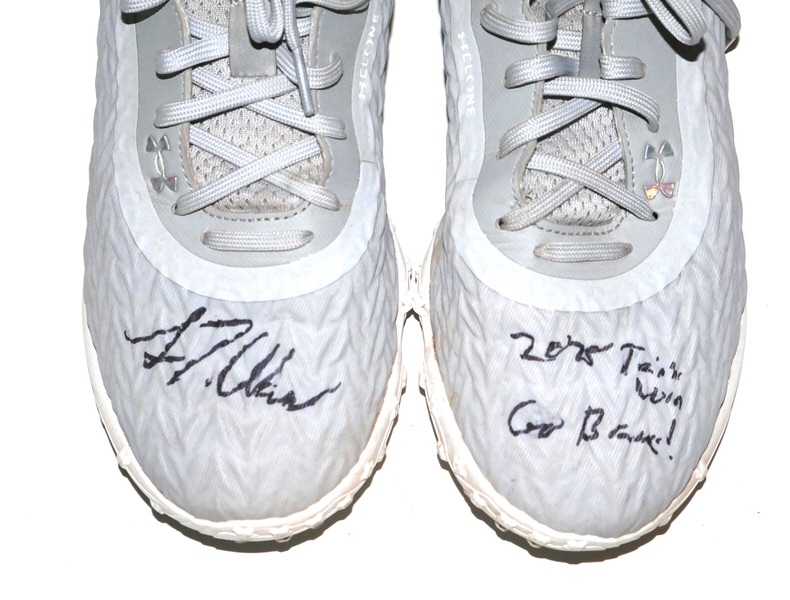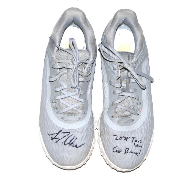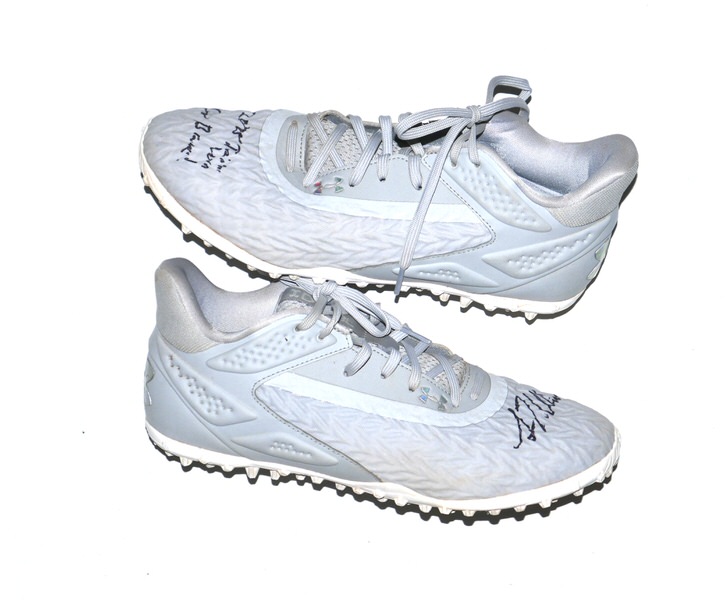 The featured grey Under Armour Shoes were worn in training by Luke Waddell in 2025 as a member of the Gwinnett Stripers. The Gwinnett Stripers are a Minor League Baseball team of the International League (IL) and the Triple-A affiliate of the Atlanta Braves. They play their home games at Coolray Field in unincorporated Gwinnett County, Georgia (with a Lawrenceville address) in suburban Atlanta, Georgia. They are named for striped bass in reference to the popularity of fishing in the region. In 2025, Waddell hit .263 in 353 At-Bats for the Stripers. Waddell signed the right shoe and added “2025 Training Worn Go Braves!” to the left one in black. There is a Gwinnett Stripers player issued “12” label on the inside tongue of each shoe. The Shoes show good wear and were obtained directly from Luke Waddell!!!!
