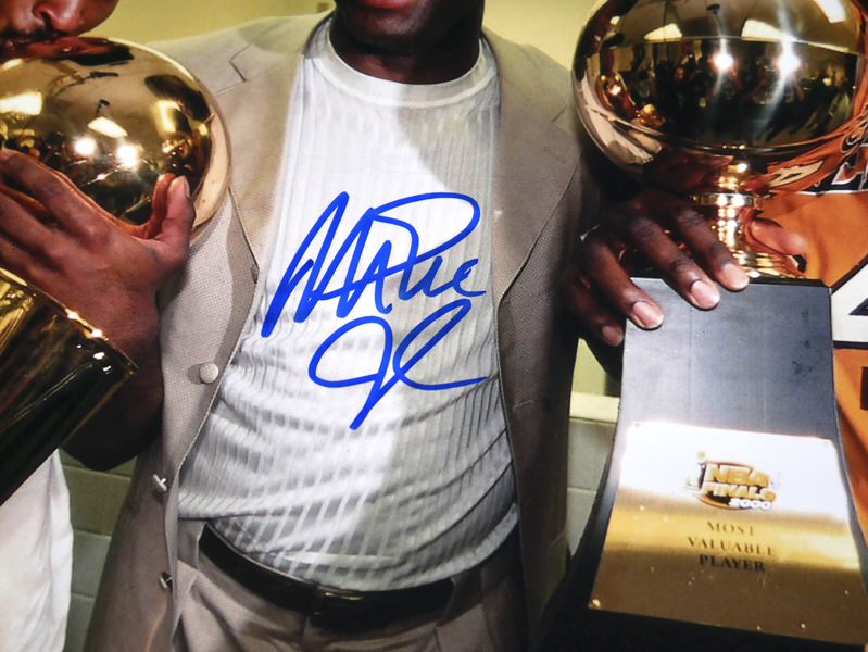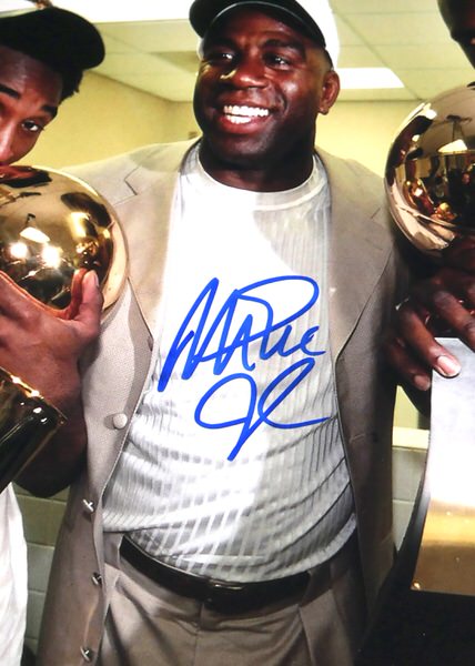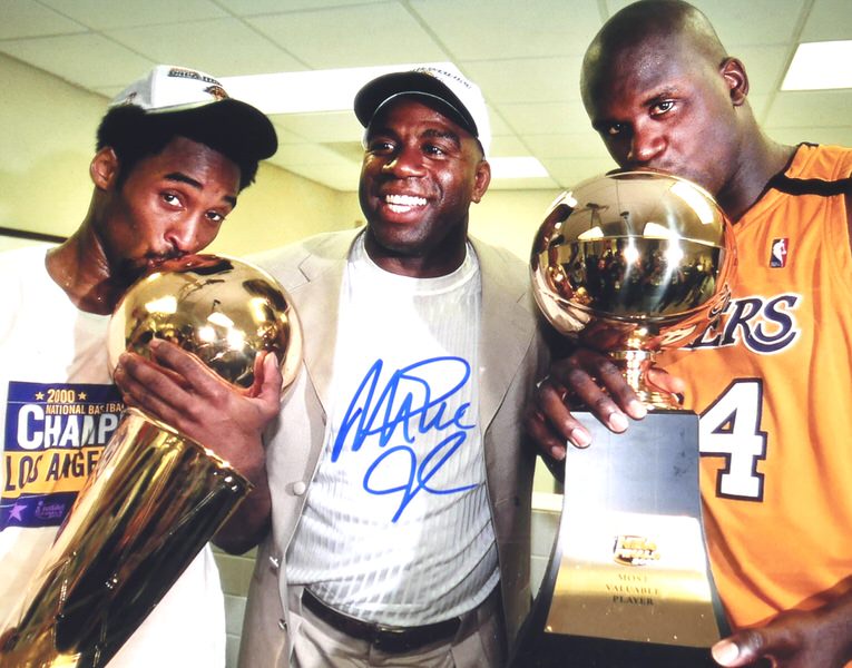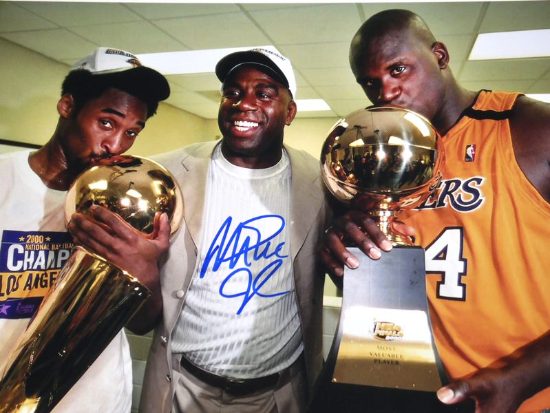 The featured 11 x 14 Photo captures absolute exhilaration as Magic Johnson celebrates a Lakers Championship with Kobe Bryant and Shaquille O’Neal. Lakers legend Magic Johnson signed the Photo in blue. The Photo includes an official Beckett Authentication Services serially numbered hologram for authenticity purposes.