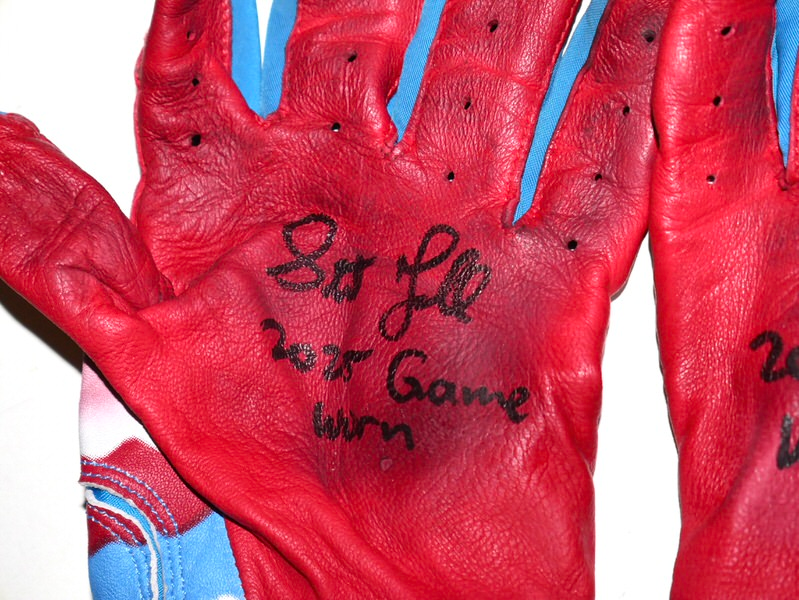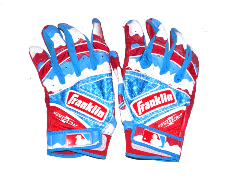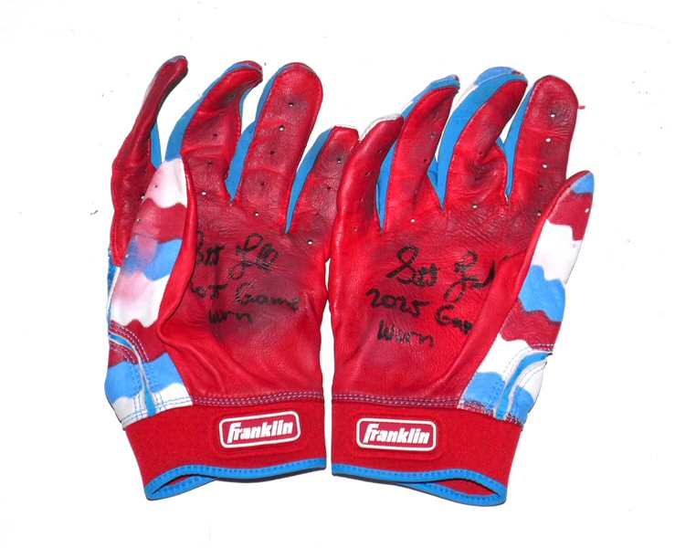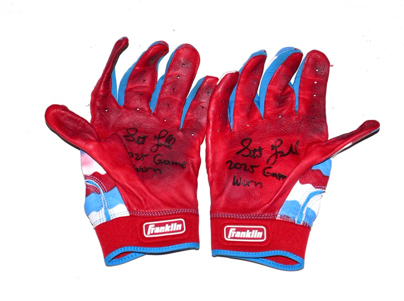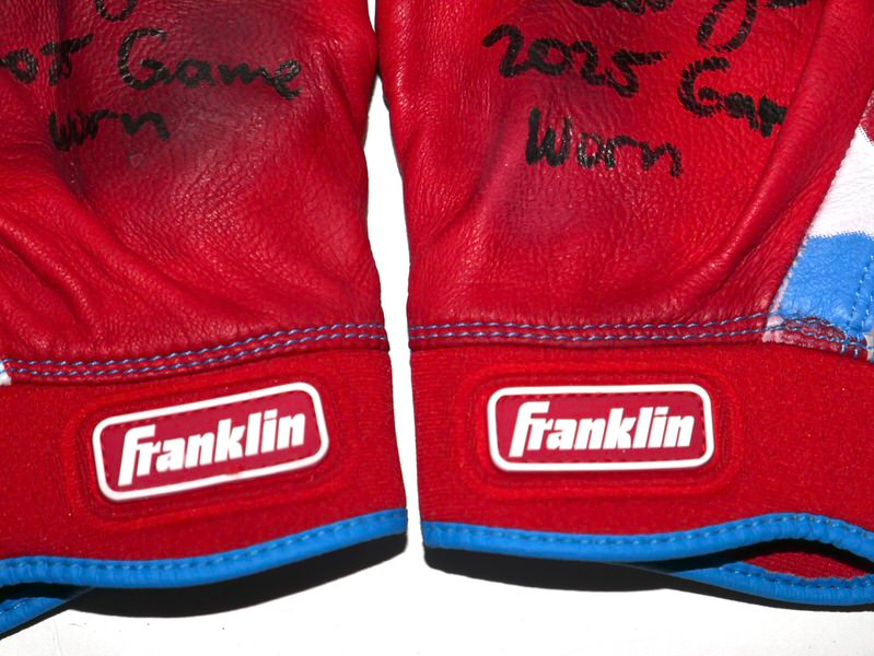 The featured July 4th Franklin Powerstrap Batting Gloves were game worn by Stuart Fairchild in 2025 as a member of the Atlanta Braves. Fairchild played in 28 Games for the Braves in 2025, slashing .216/.273/.333. The talented outfielder signed the Gloves and added “2025 Game Worn” in black. The Gloves were obtained directly from Stuart Fairchild!