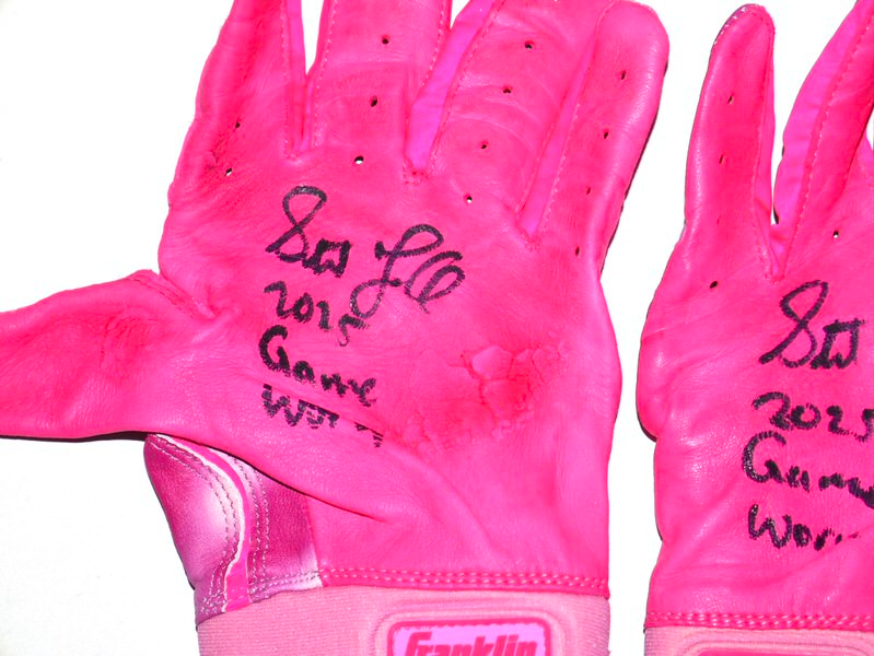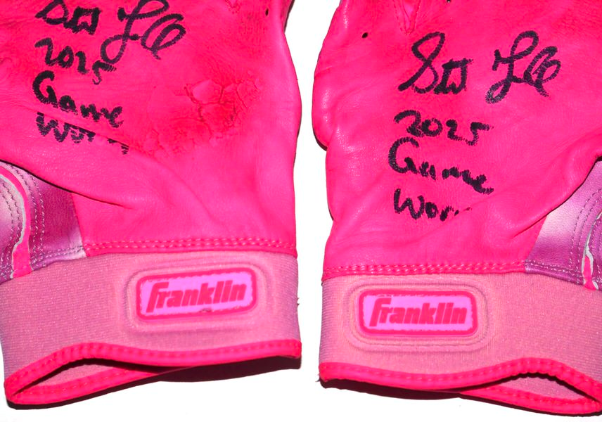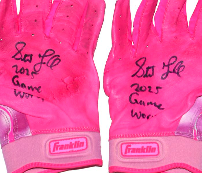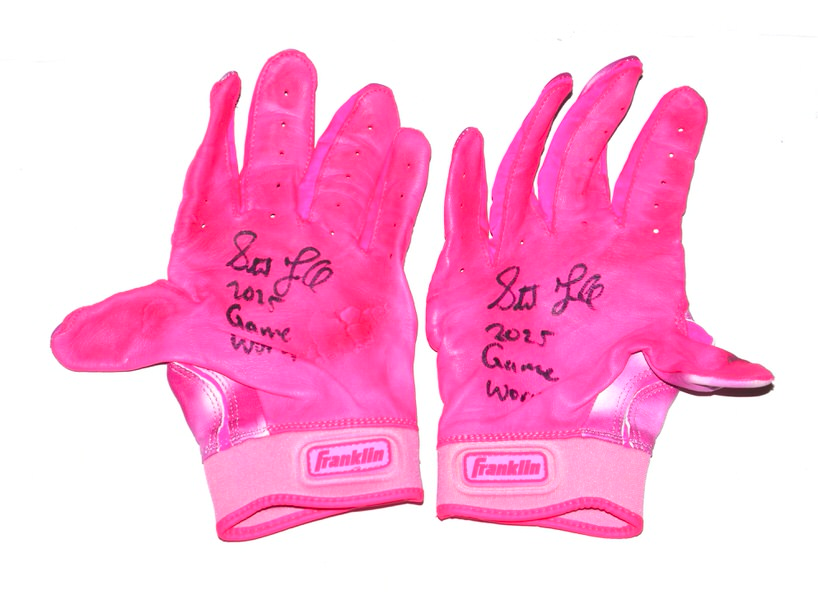 The featured pink Franklin Powerstrap Batting Gloves were game worn by Stuart Fairchild for Mother’s Day in 2025 as a member of the Atlanta Braves. In recognition of Mother’s Day on Sunday, May 11, Major League Baseball partnered with organizations that raise awareness to help reduce rates of breast cancer. Fairchild played in 28 Games for the Braves in 2025, slashing .216/.273/.333. The talented outfielder signed the Gloves and added “2025 Game Worn” in black. The Gloves show good use and were obtained directly from Stuart Fairchild!