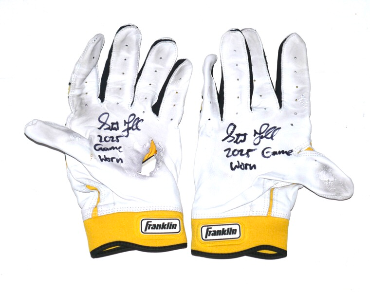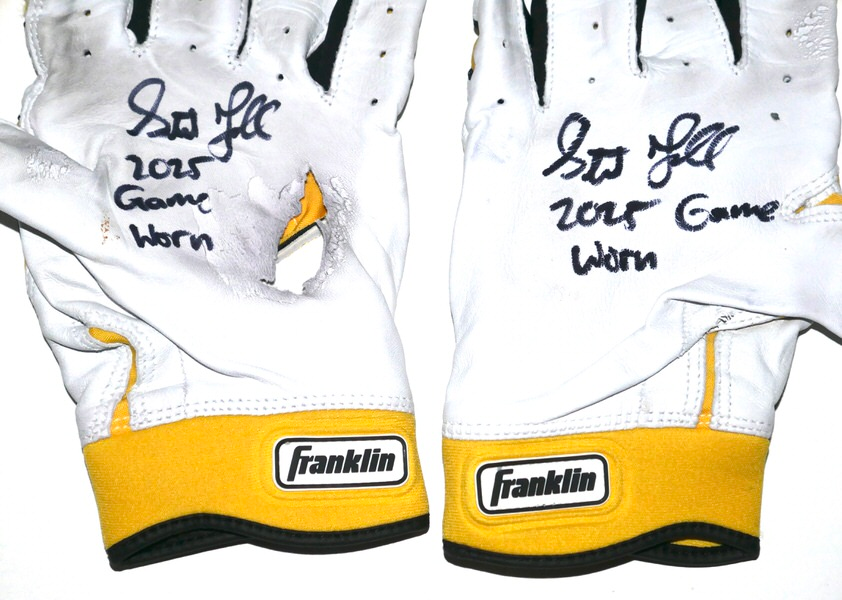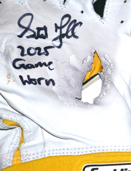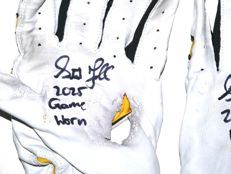 The featured white and yellow Franklin Powerstrap Batting Gloves were game worn by Stuart Fairchild in 2025 as a member of the Atlanta Braves. Fairchild played in 28 Games for the Braves in 2025, slashing .216/.273/.333. The talented outfielder signed the palm of the Batting Gloves and added “2025 Game Worn” in black. The Batting Gloves show good use with a tear to the palm of the left glove. The Gloves were obtained directly from Stuart Fairchild!