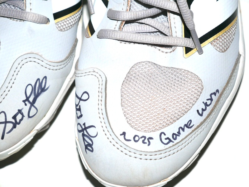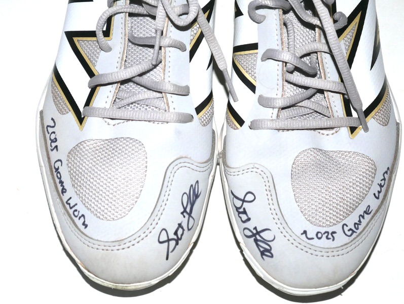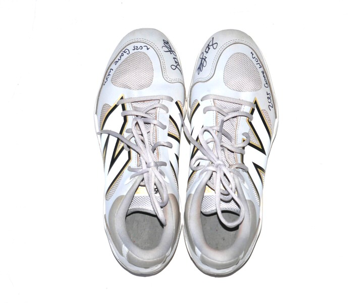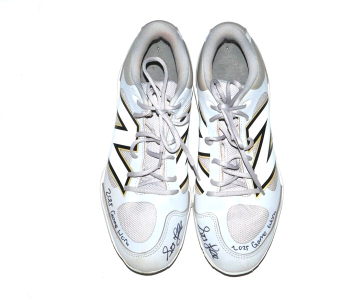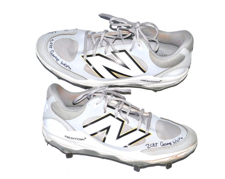 The featured grey and white New Balance Fresh Foam 3000v7 Cleats were game worn by Stuart Fairchild in 2025 Spring Training as a member of the Cincinnati Reds. Fairchild played in 21 Games and had 45 plate appearances for the Reds. The talented outfielder signed the Cleats and added “2025 Game Worn” in black. There is a Cincinnati Reds player issued number “17” label on the tongue of each cleat. The Cleats were obtained directly from Stuart Fairchild!