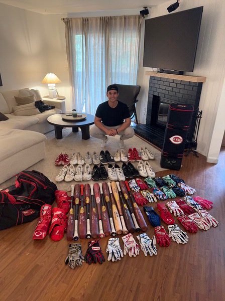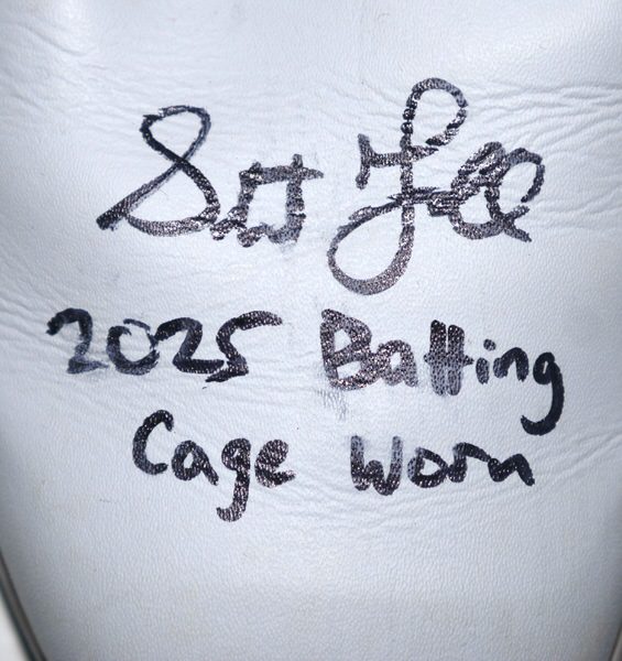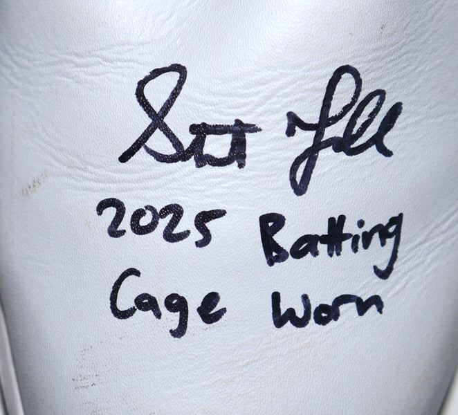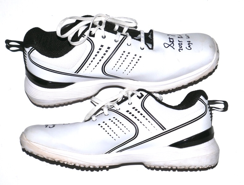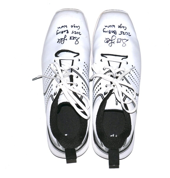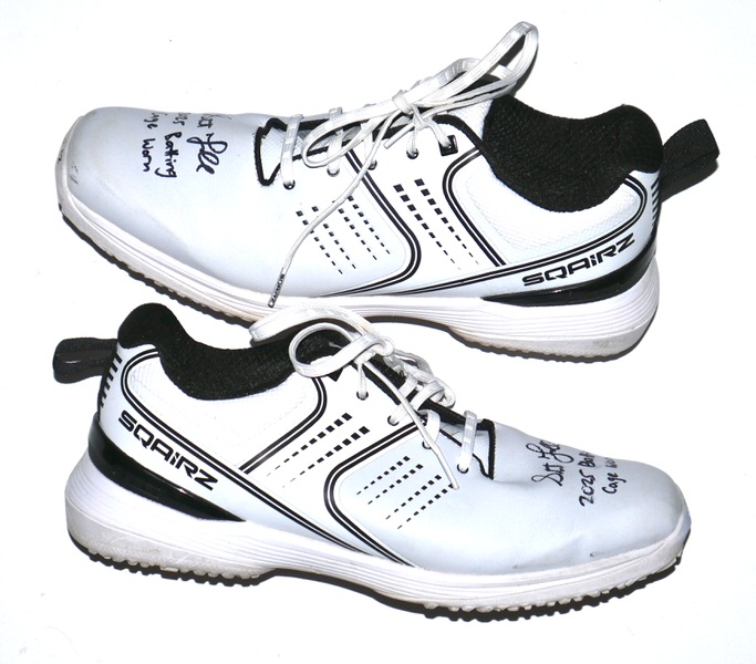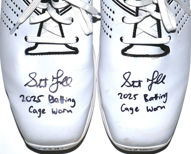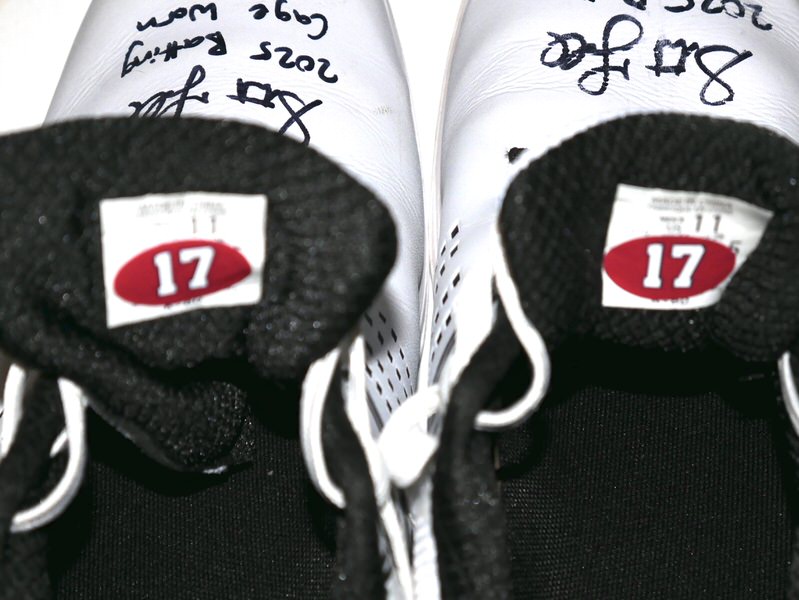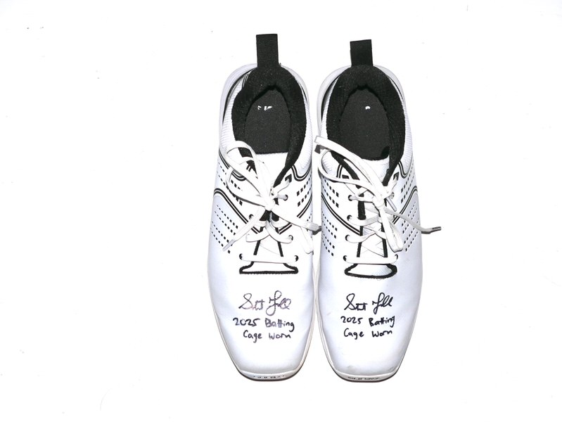 The featured size 11 white Sqairz Turf Shoes were worn by Stuart Fairchild in the Batting Cage in 2025 Spring Training as a member of the Cincinnati Reds as well as a member of the Atlanta Braves during the 2025 MLB Season. Fairchild played in 28 Games for the Braves in 2025, slashing .216/.273/.333. The talented outfielder signed the Shoes and added “2025 Batting Cage Worn” in black. The signature and inscription has slightly smudged on the right shoe. (Please see Images) There is a Cincinnati Reds player issued “17” label on the tongue of each shoe. The Shoes show light wear and were obtained directly from Stuart Fairchild!