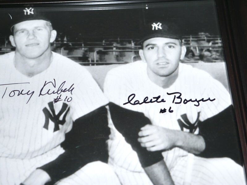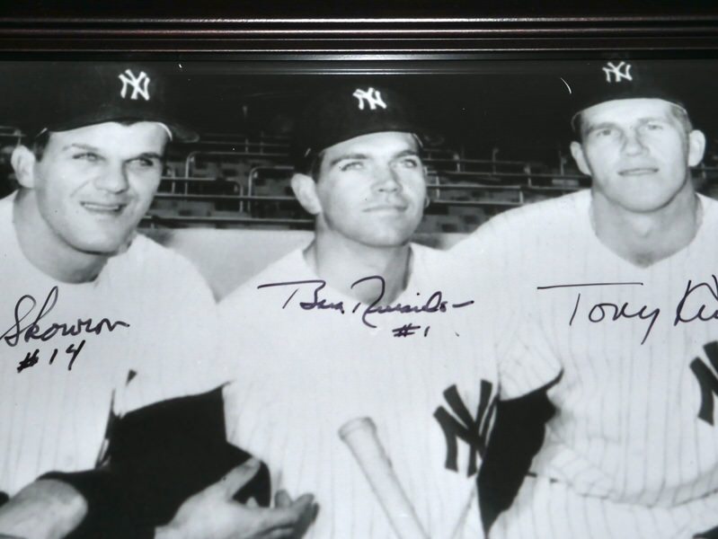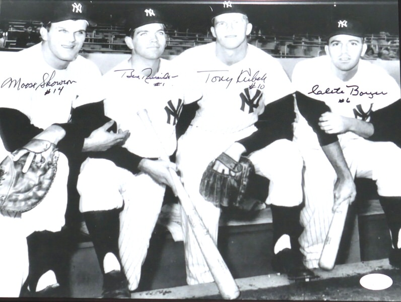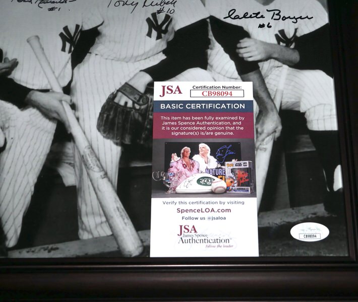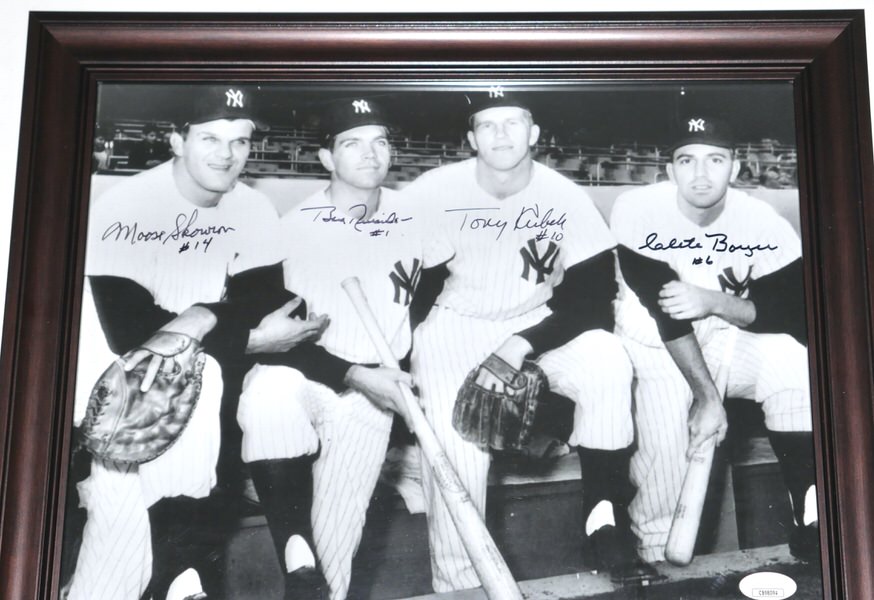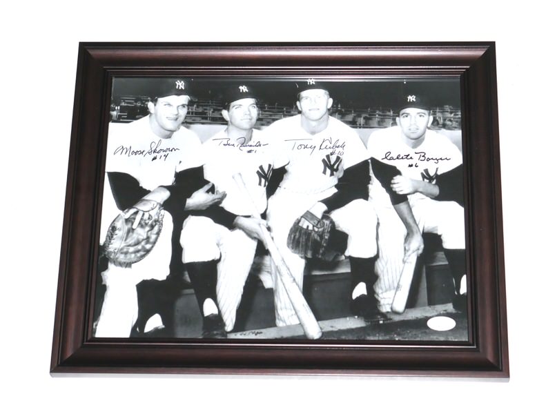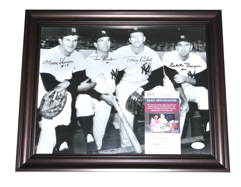 The featured 8 x 10 Photo has been custom framed and signed by New York Yankees World Series Champs starting infielders third baseman Clete Boyer, shortstop Tony Kubek, second baseman Bobby Richardon and first baseman Moose Skowron. The Yankee greats have signed the Photo in black. The Photo includes an official James Spence Authentication (JSA) hologram and matching COA for authenticity purposes. The custom framed photo display measures approximately 13.25” x 16.25” in size.